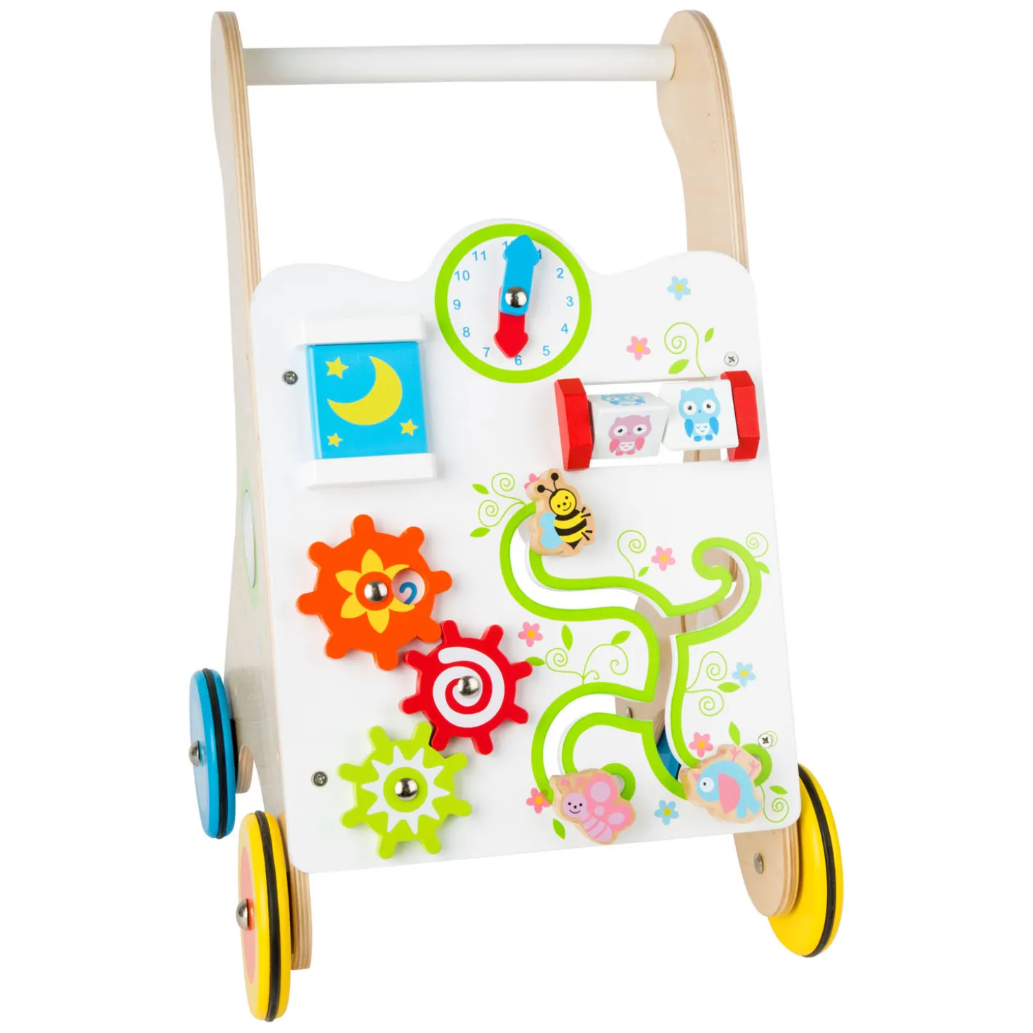 Spelenderwijs leren lopen! Dat is kinderspel met deze houten loopwagen met tal van felgekleurde details. Dit stabiele multitalent op stille wielen heeft zoveel te ontdekken aan boord. Kleine dieren en bloemen kunnen door het labyrint worden bewogen, de uilen en tandwielen kunnen worden gedraaid en er is zelfs een lerende klok met beweegbare wijzers en een spiegel! De schattige motieven en felle kleuren brengen elk kind in een goed humeur en wekken een drang om te ontdekken. We hebben aan alles gedacht: de met rubber afgewerkte wielen voorkomen dat de rollator wegglijdt. Zo kunnen de jongste kinderen helemaal zelf hun eerste stapjes zetten – en ondertussen veel speelplezier beleven met deze vrolijk gekleurde loopwagen!
