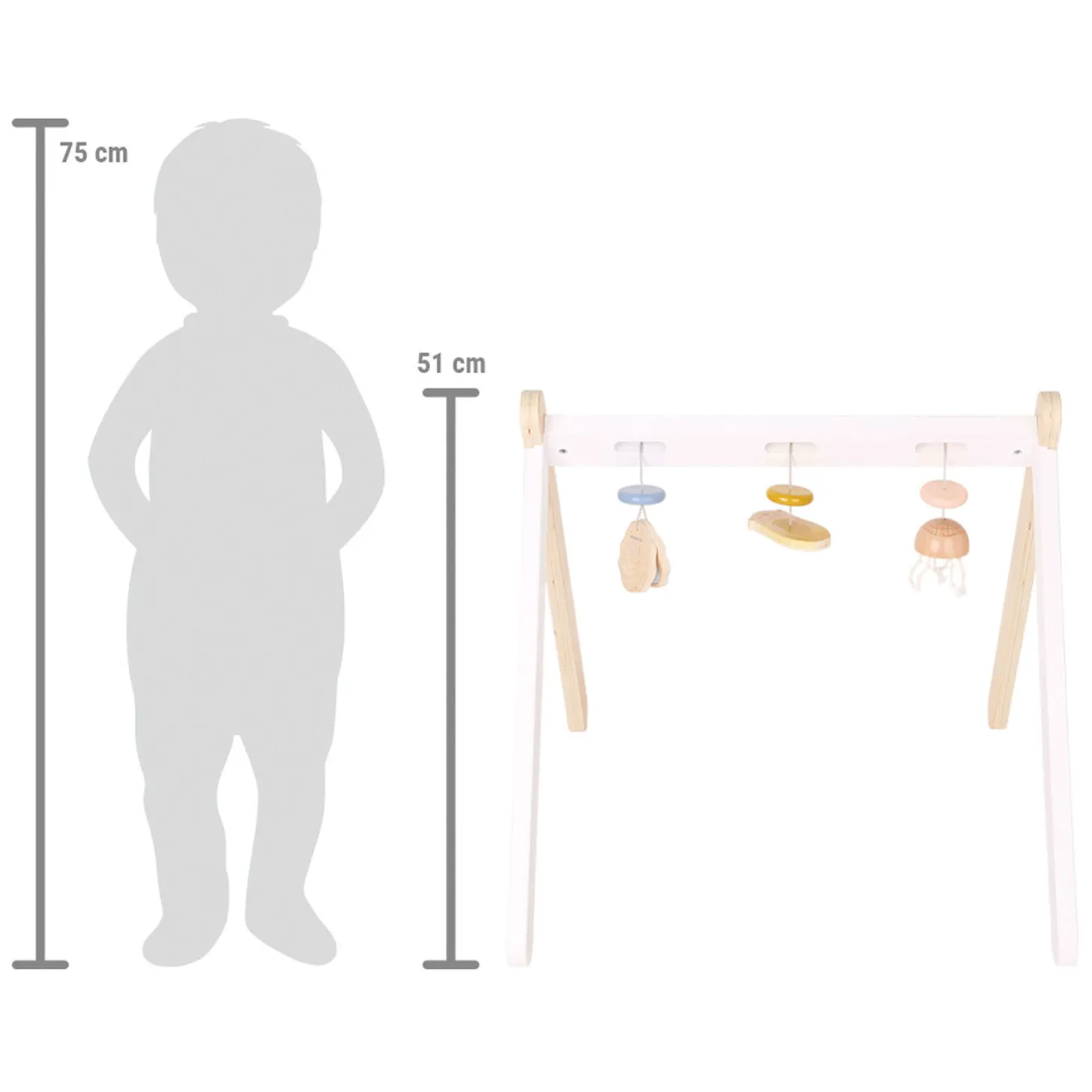 Dankzij het hoge aandeel zichtbaar houtmateriaal is het een absolute blikvanger en verstandig eerste speeltje voor vermaak en ter versterking van de motoriek bij liggende baby’s: de zeeotter, oester en kwal kunnen zonder gereedschap aan de drie sleuven worden bevestigd door ze erin te steken door. En dit is goed om te weten: de driedimensionale speelelementen zijn vooral voor liggende baby’s goed te zien! De speelboog is eenvoudig te monteren dankzij de in elkaar grijpende zijstukken en twee schroeven.