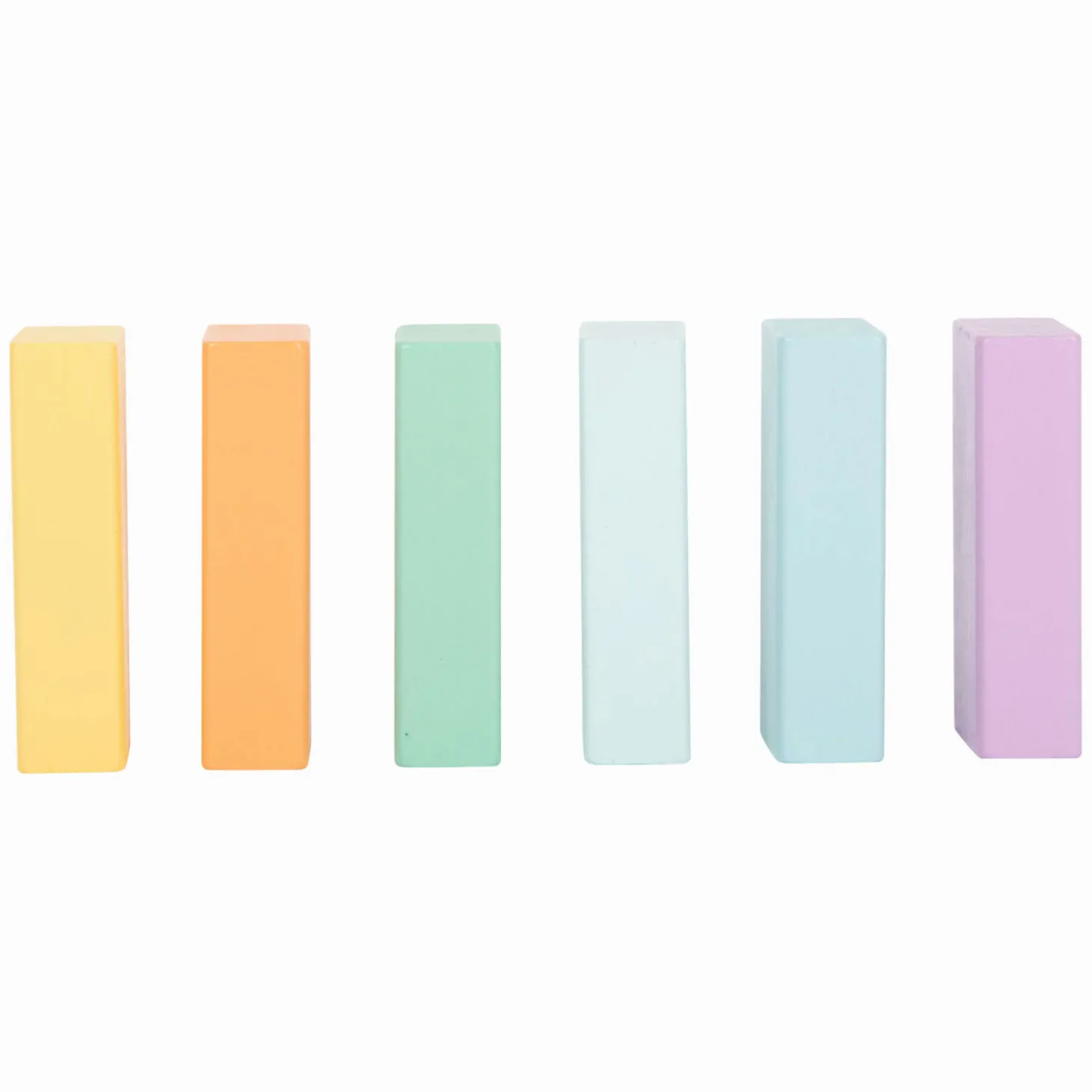 Afmetingen: blokjes ca. 3 x 3 x 3 cm; rechthoek ca. 9 x 3 x 1,5 cm. Geschikt voor kinderen vanaf 12 maanden oud.