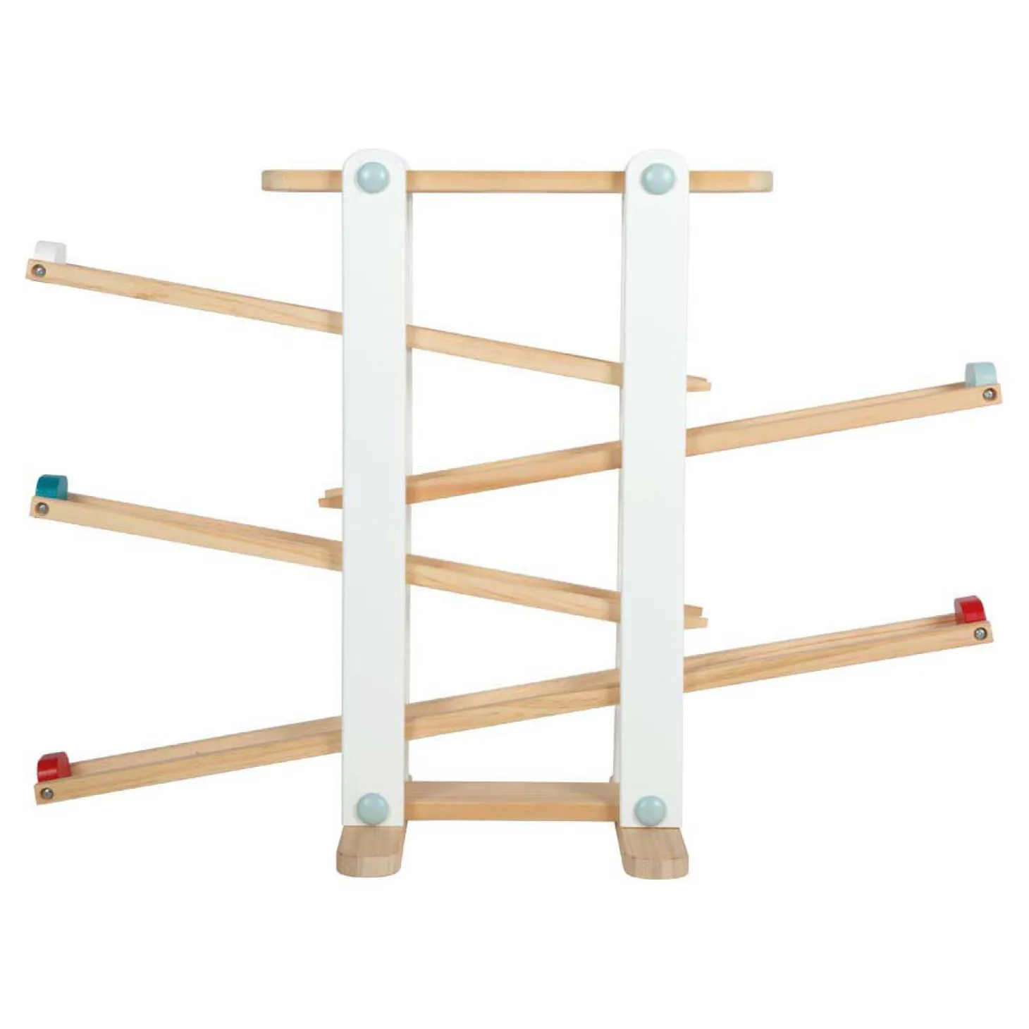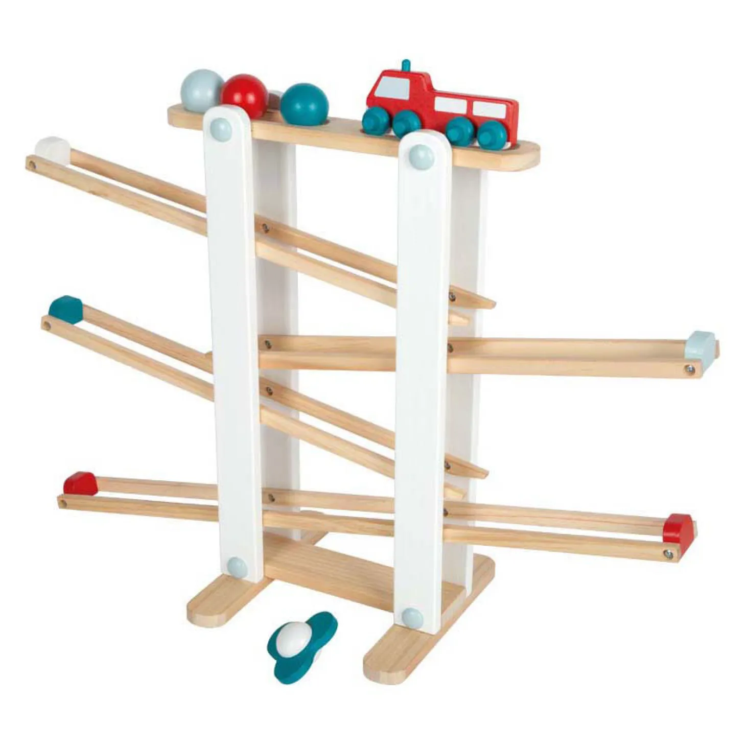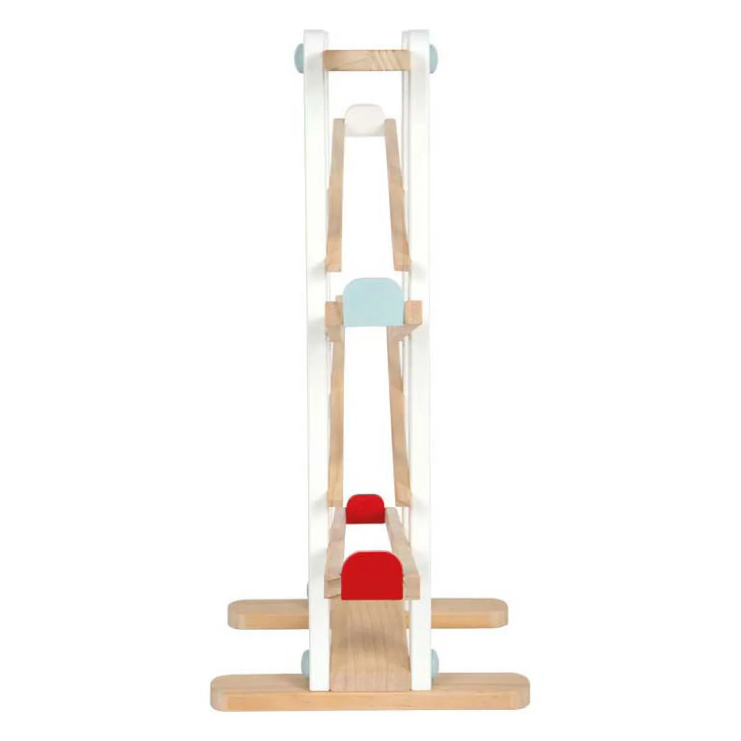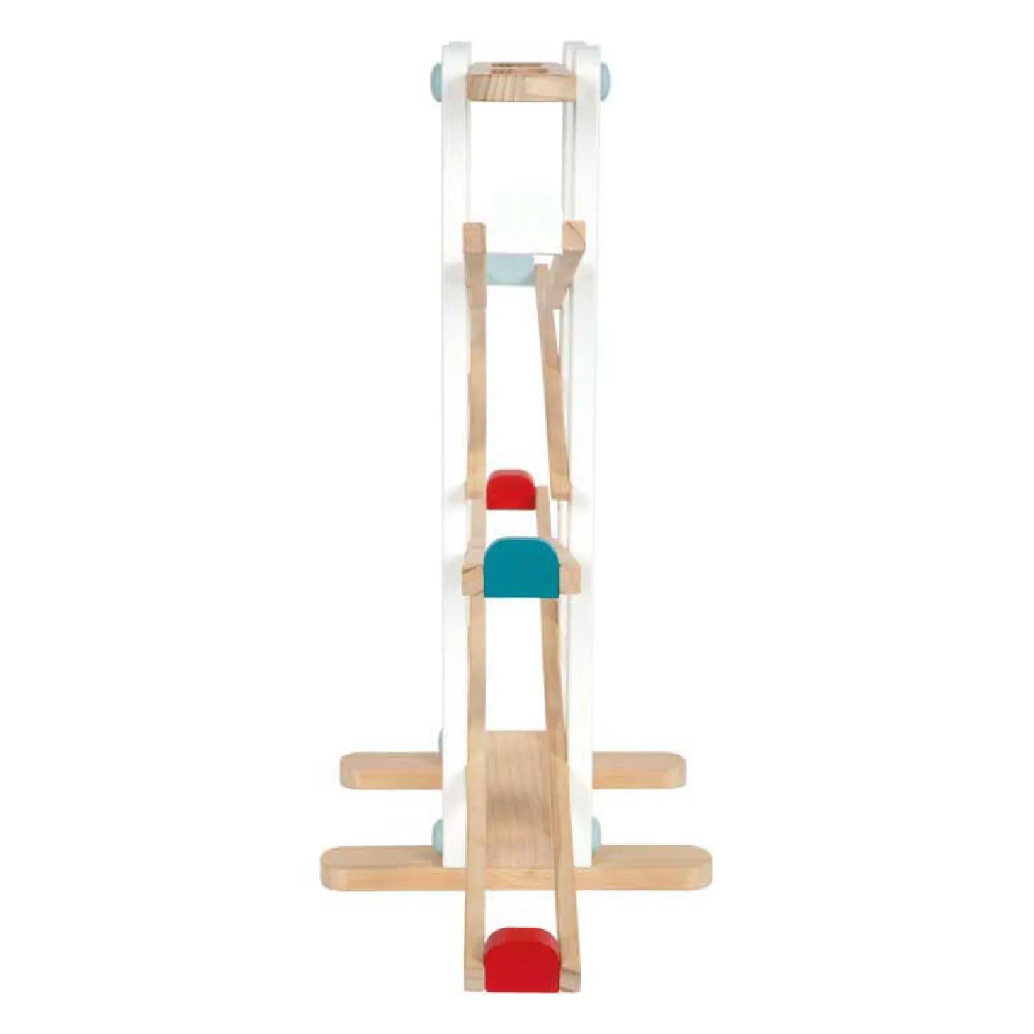 De ballen zorgen voor een fascinerende, leuke show op hun weg naar beneden van niveau naar niveau. Wit geschilderd en natuurlijk hout gecombineerd met de klassieke kleuren blauw en rood maken deze marmeren loop tot een eyecatcher die op subtiele en tijdloze wijze in elke kinderkamer past. Het spelen met knikkerbanen bevordert de ontwikkeling van de motoriek en de hand-oogcoördinatie van kinderen en zorgt ervoor dat er geen verveling ontstaat in de kinderkamer!
