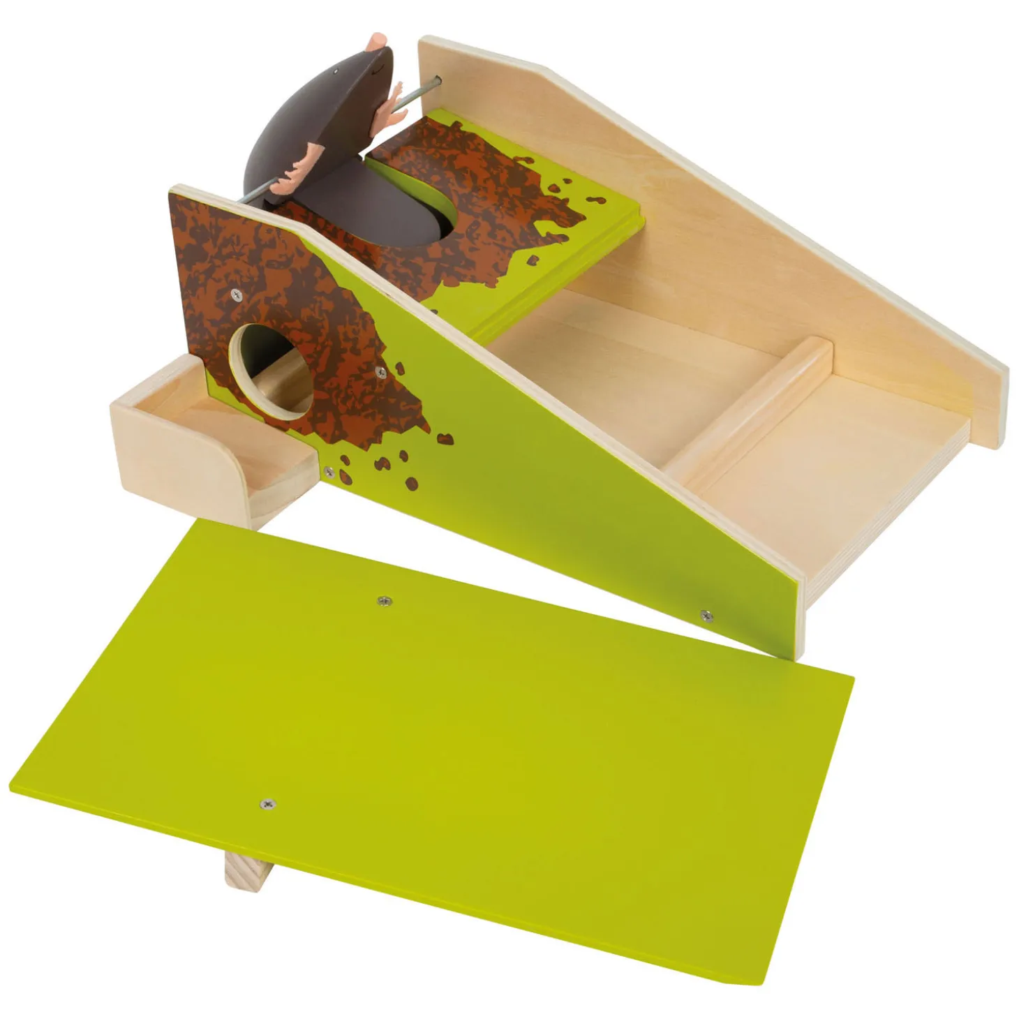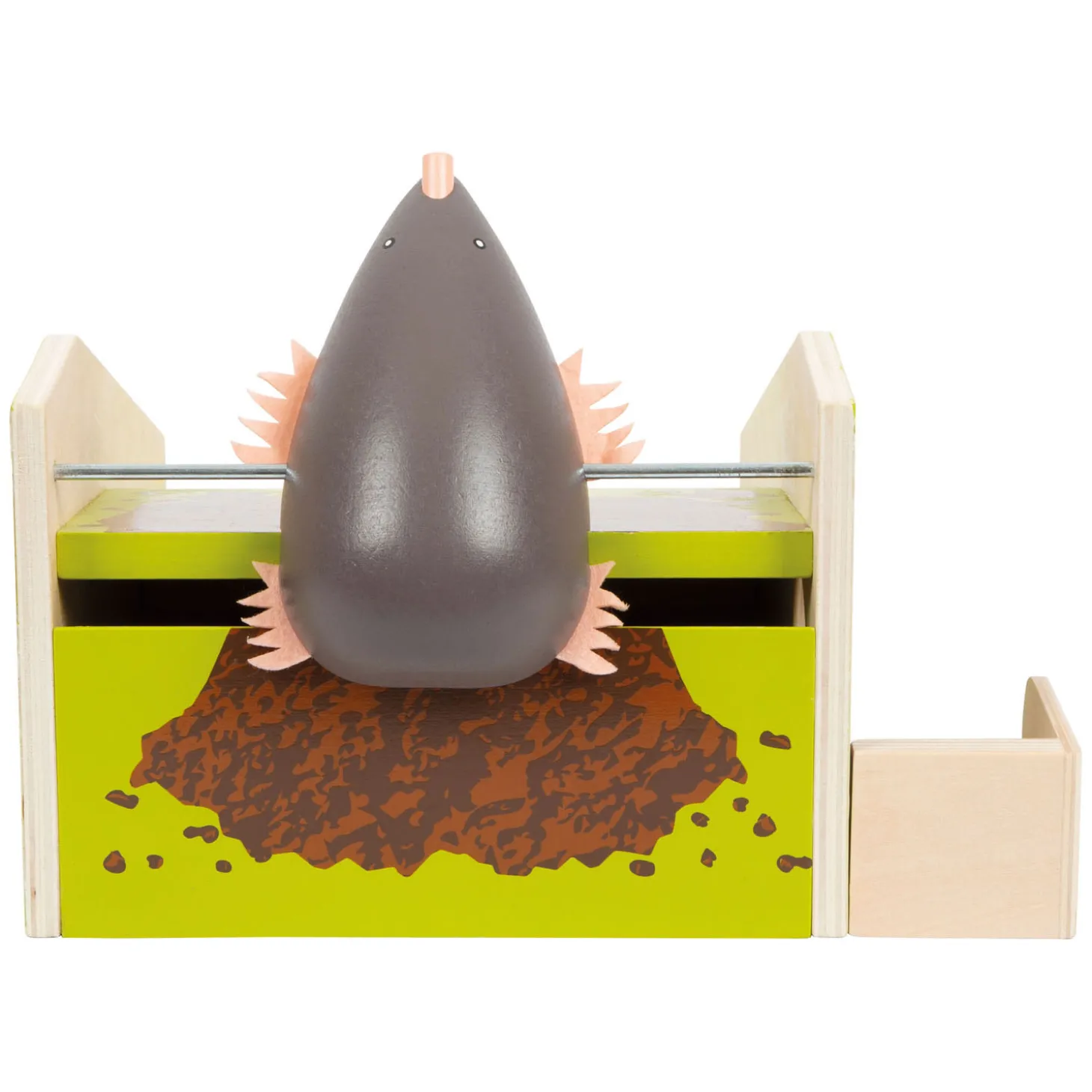 •De mol komt tevoorschijn en zwaait met zijn kop en poten wanneer de bal in het hol van de mol wordt geslagen