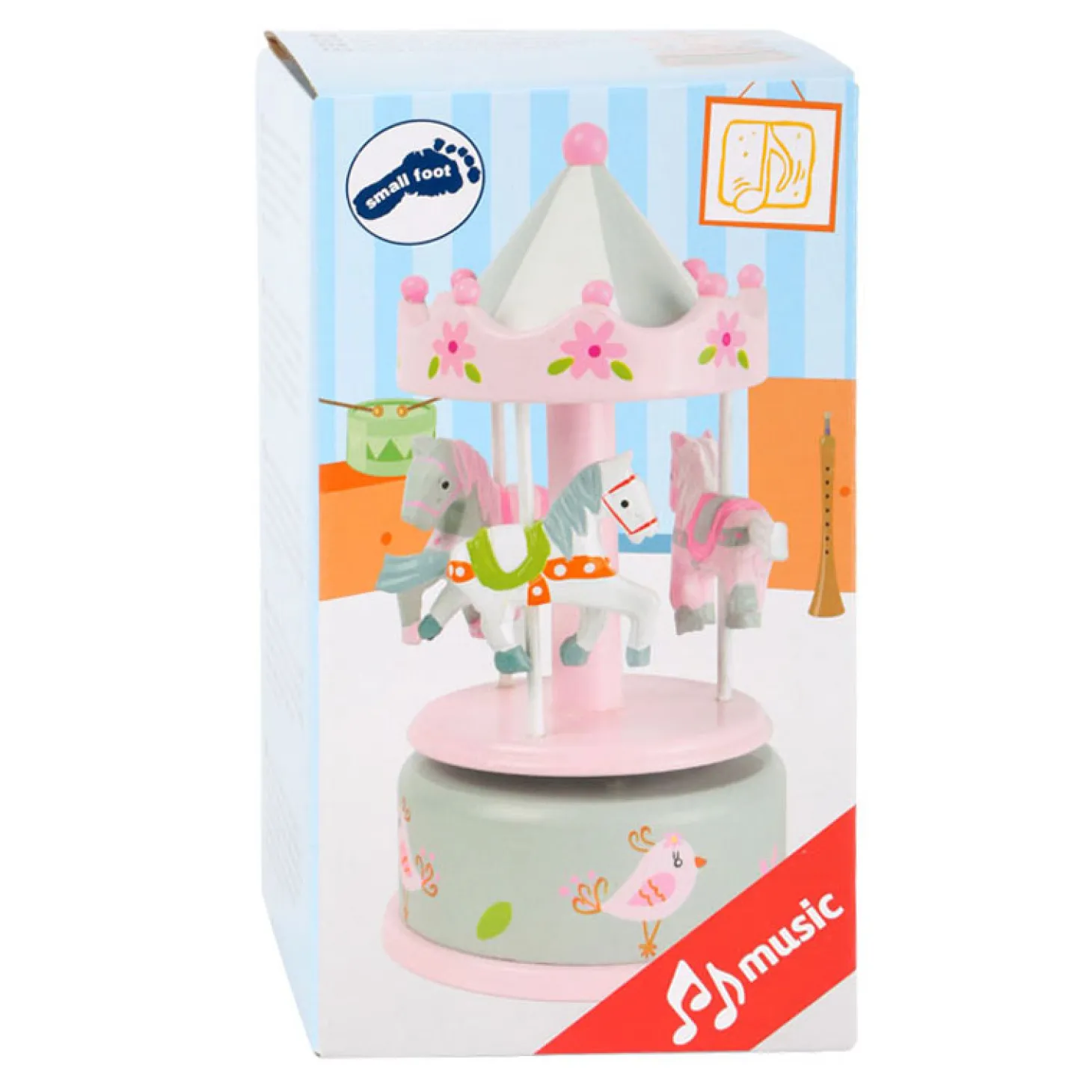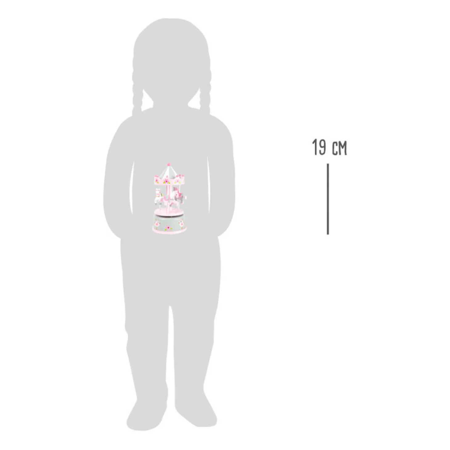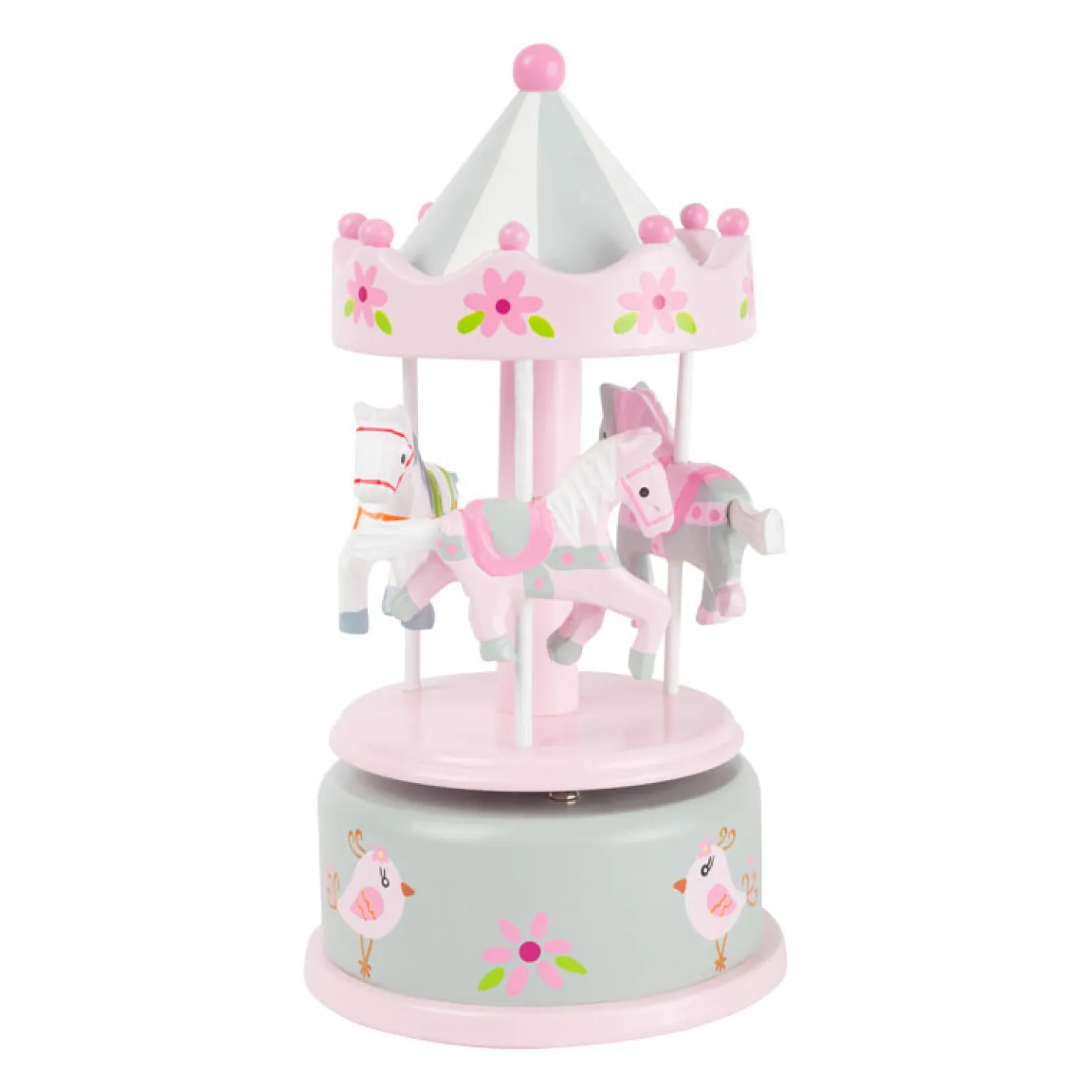 Wie is hier al in slaap gevallen? Deze klassieke houten muziekdoos zal elk kind in slaap brengen. De rotondepaarden draaien vrolijk rond op de melodie van “Waar moet ik beginnen?”. De decoratieve kleuren en het nostalgische design maken van deze box een echte eyecatcher op het nachtkastje. Met zijn prachtig witte hobbelpaardjes is dit misschien wel de mooiste draaimolen van het land. Wie windt de muziekdoos nog een keer op? De carrousel is 19 cm hoog.