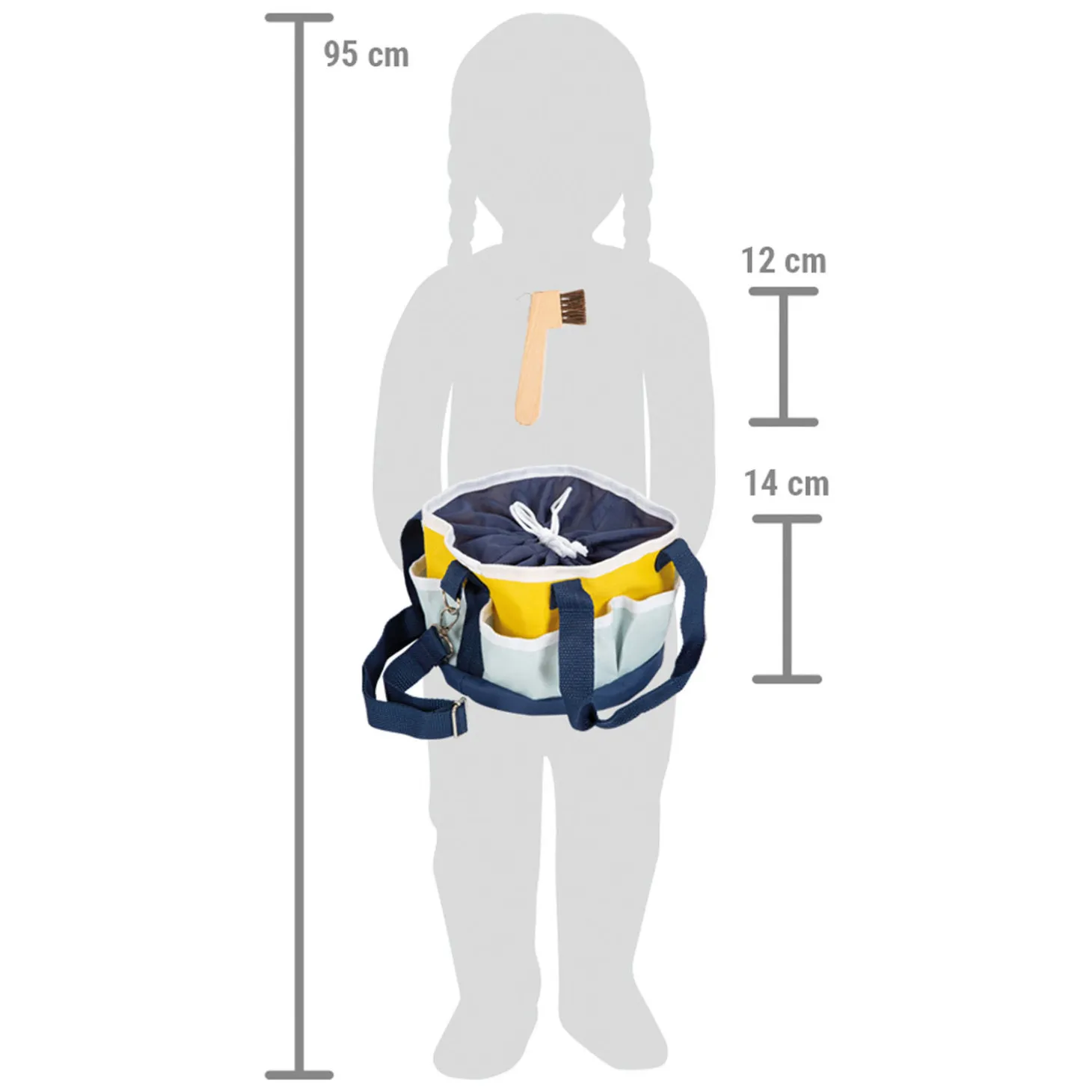 De paardenverzorgingsgereedschappen in de tas zijn perfect afgestemd op de behoeften van jonge paardenliefhebbers, zodat jonge ruiters hun fantasie echt de vrije loop kunnen laten tijdens het stokpaardrijden. Het handige trekkoord maakt het mogelijk de tas wijd te openen maar ook volledig te sluiten. Deze kindvriendelijke tas kan worden gedragen aan beide handvatten of aan de verstelbare schouderbanden. Met deze verzorgingsset kunnen kinderen hun favoriete houten paard of stokpaard net als de professionals schoonmaken tijdens realistisch rollenspel! De speciaal ontwikkelde accessoiretas voor schoonmaak is ideaal voor kleine kinderhanden, en het toernooi lint kan worden versierd met de bijgeleverde stickers.