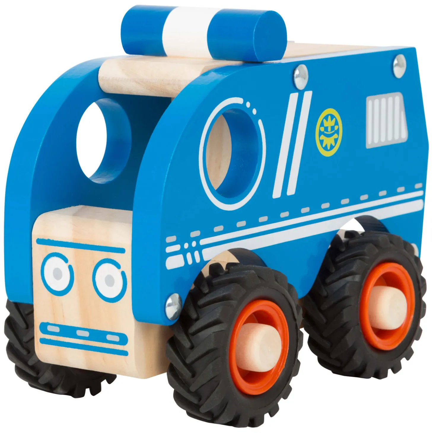 Waar verstopt de inbreker zich? Deze compacte politieauto van 100% FSC-gecertificeerd hout is klaar om uit te rollen naar de volgende wilde missie. Het houten voertuig snelt weg over glad en ruw terrein met de robuuste, met rubber afgewerkte wielen. Als de dief wordt gepakt, is er ruimte voor hem in de kofferbak en kan de kleine speelgoedpolitieagent hem naar de gevangenis sturen terwijl hij op zijn bestuurdersstoel zit. Een creatieve verrijking voor het wagenpark in de kinderkamer.