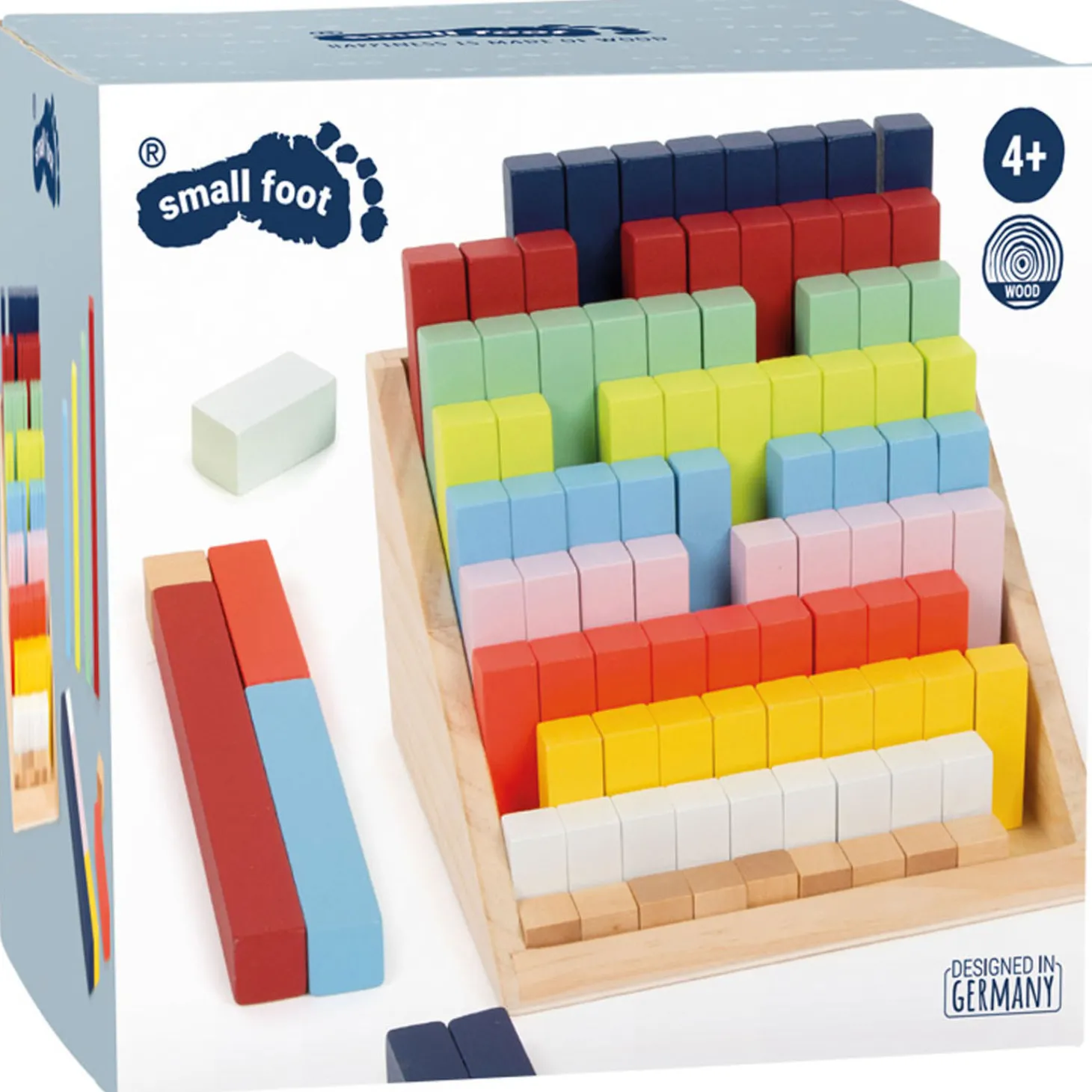 Gebruik de staven bijvoorbeeld bij het leren van breuken. Als voorbeeld kun je 1/10 uitleggen met de langste staaf en de 10 kleinste blokjes. Als je de 10 kleinste blokjes opstapelt, heeft dit dezelfde lengte als de donkerblauwe staaf. Haal steeds een blokje weg en vertel de eerste paar keer zelf waar het aan gelijk staat: “Dit is 9/10, dit 8/10,…”. Vraag daarna aan de kinderen wat de breuk nu is als je nog een blokje weghaalt. Maak het steeds een stapje moeilijker door verschillende breuken weer te geven.