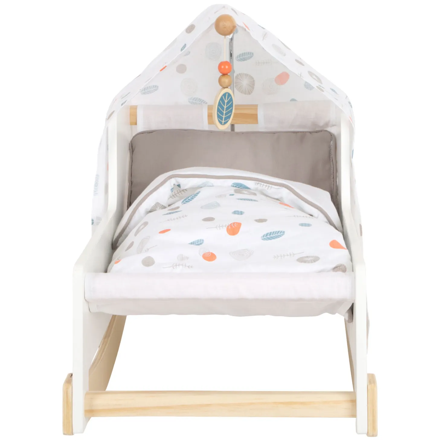 Met een bijzonder hoogwaardige afwerking, stabiele constructie, afgeronde hoeken en zichtbare massief houten elementen is deze poppenwieg een stijlvolle speeluitbreiding voor de kinderkamer.