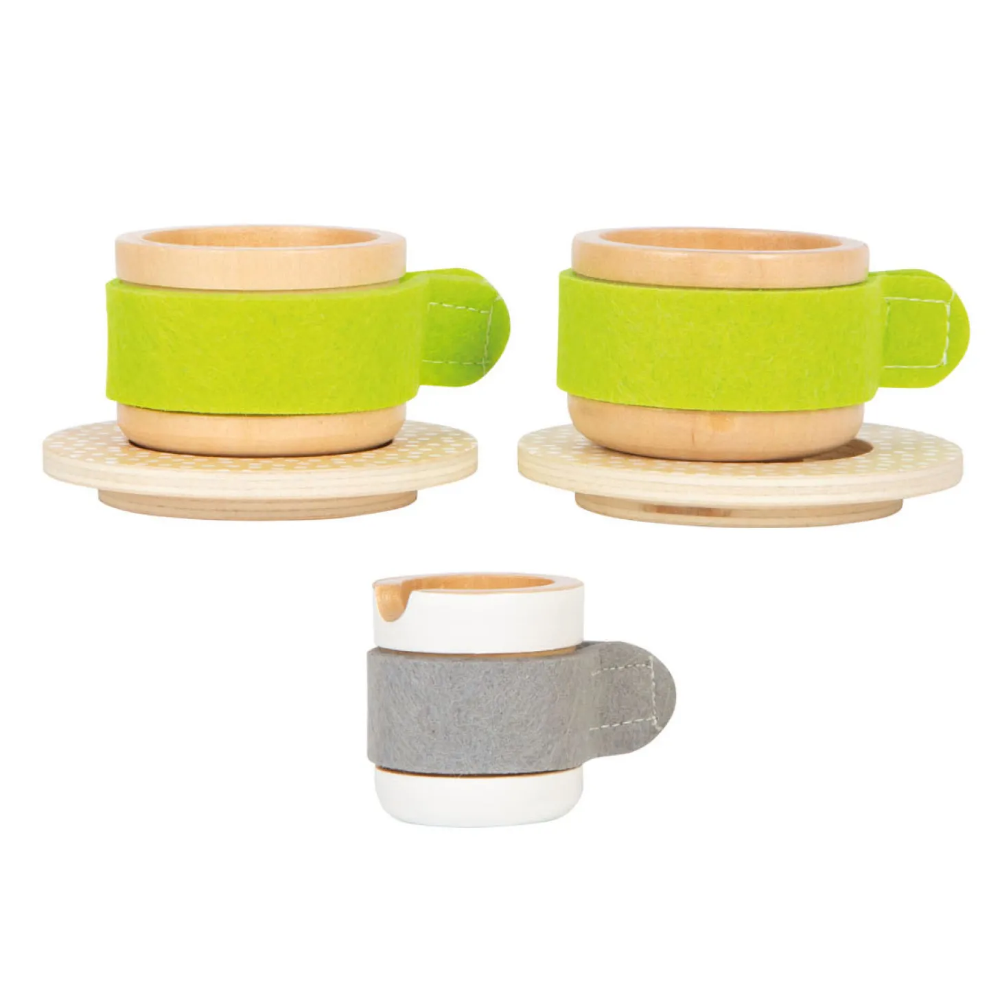 Een koffie- en thee-rollenspelset met een hoogwaardig design met moderne kleuren, liefdevolle details, een hoge zichtbare hoeveelheid houtmaterialen en haptisch aangename viltstukken. Rollenspel bevordert de ontwikkeling van verbeeldingskracht en sociale vaardigheden.
