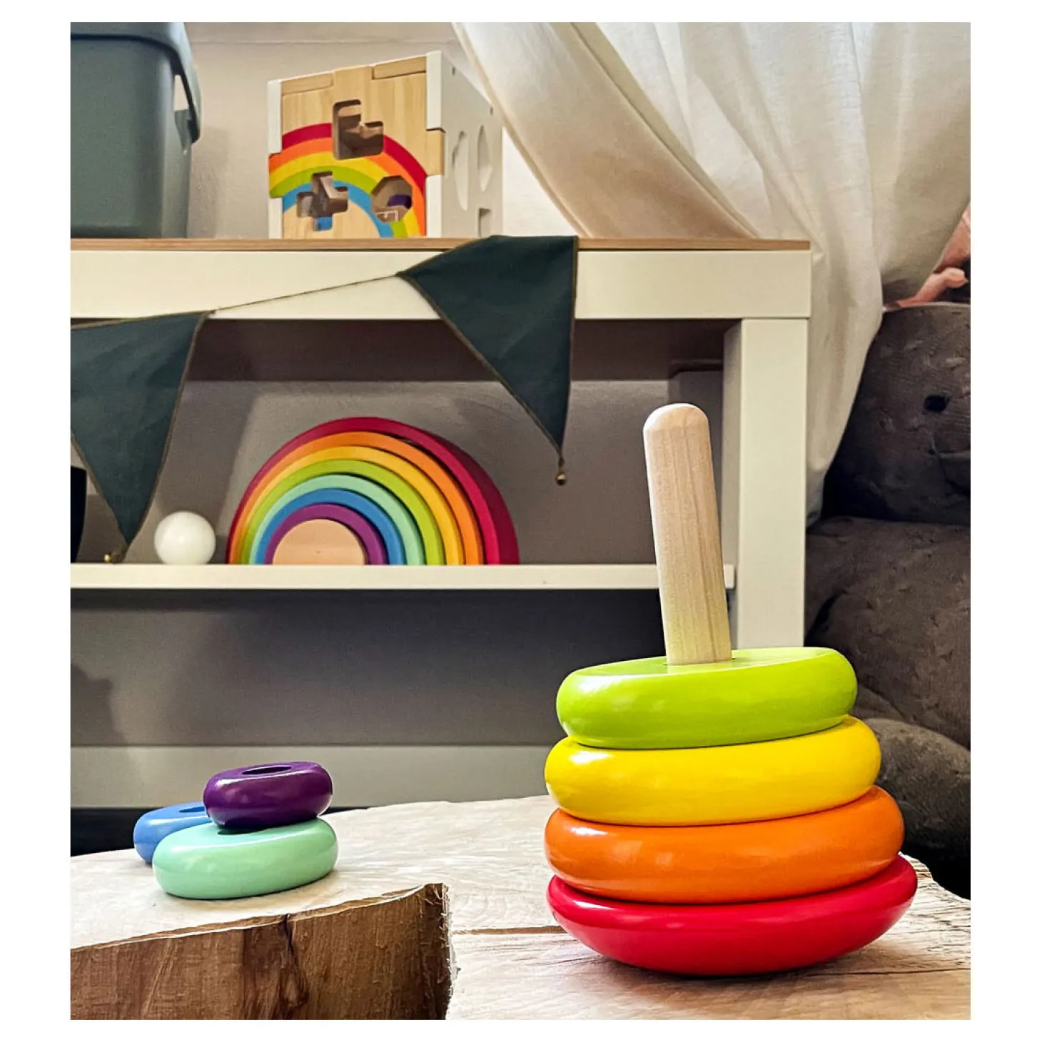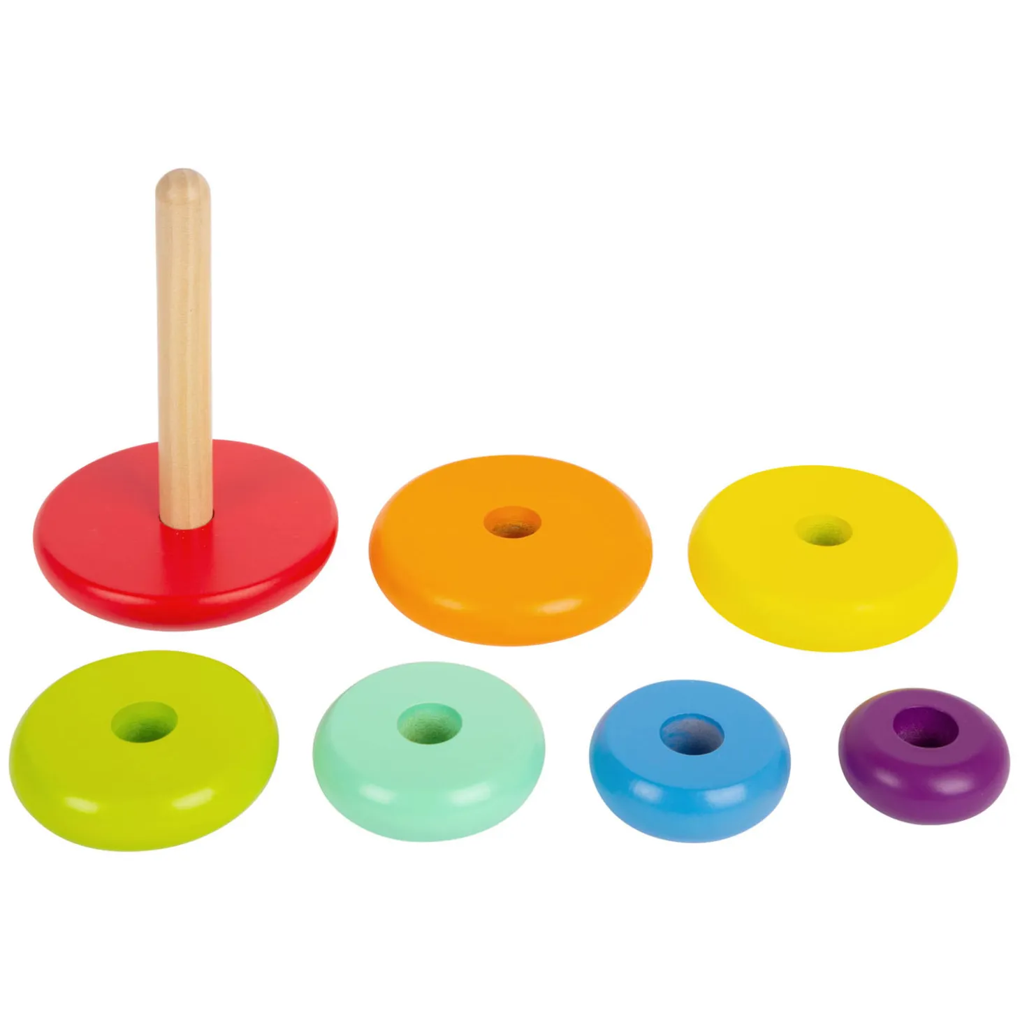 Kindvriendelijke stapelspellen van robuust hout garanderen langdurig speelplezier. De kleintjes zullen zich niet snel vervelen! De regenboogkleuren van deze klassieke motoractiviteit zorgen voor een moderne uitstraling. De stapeltoren is 15 x 10 cm groot en geschikt voor kinderen vanaf 12 maanden oud.