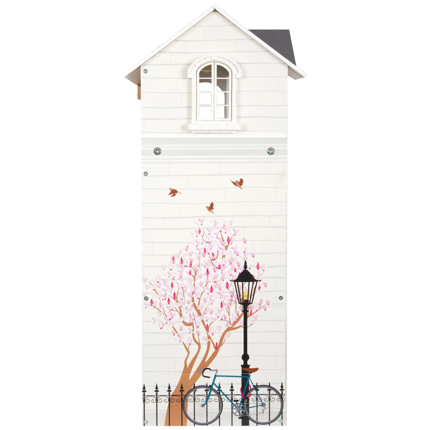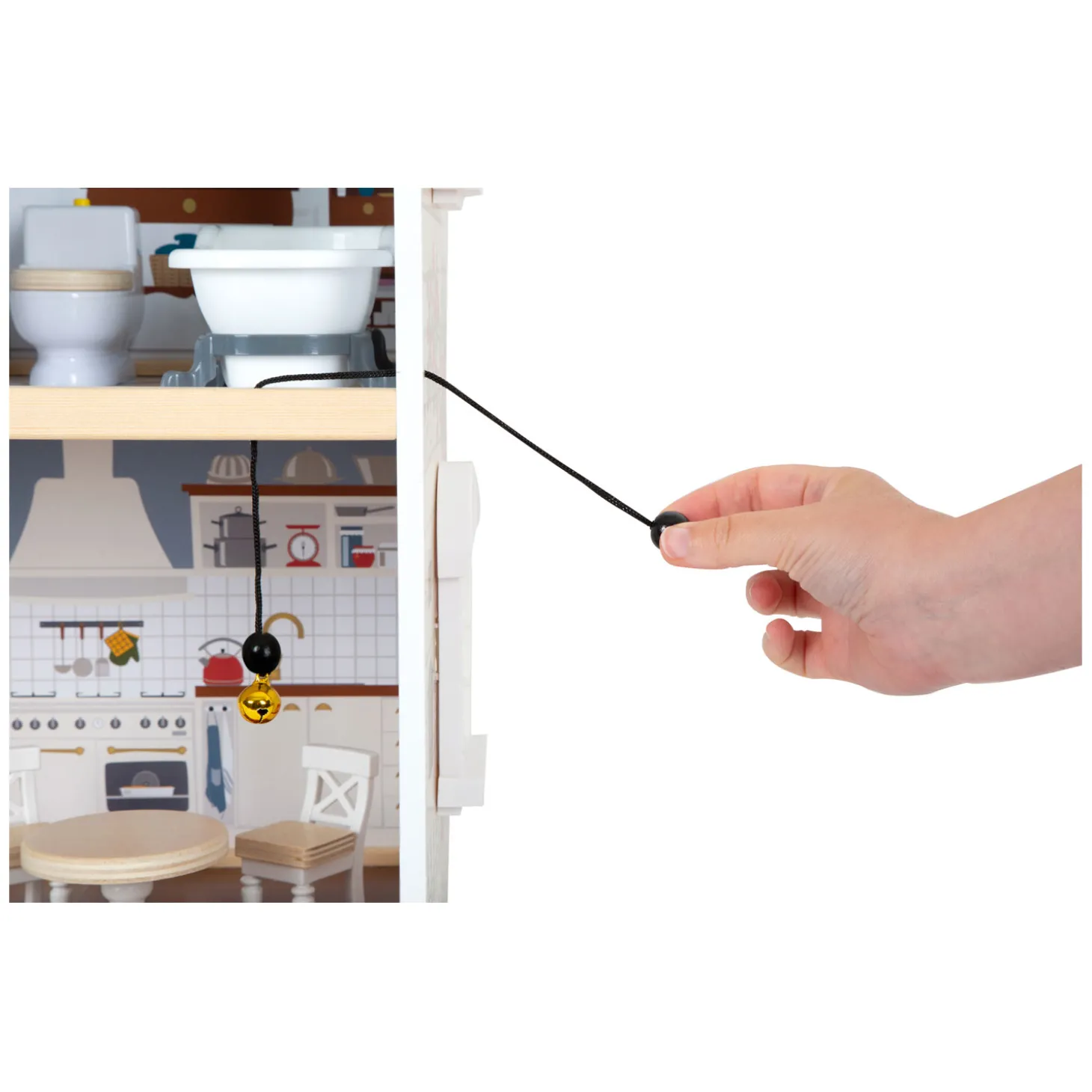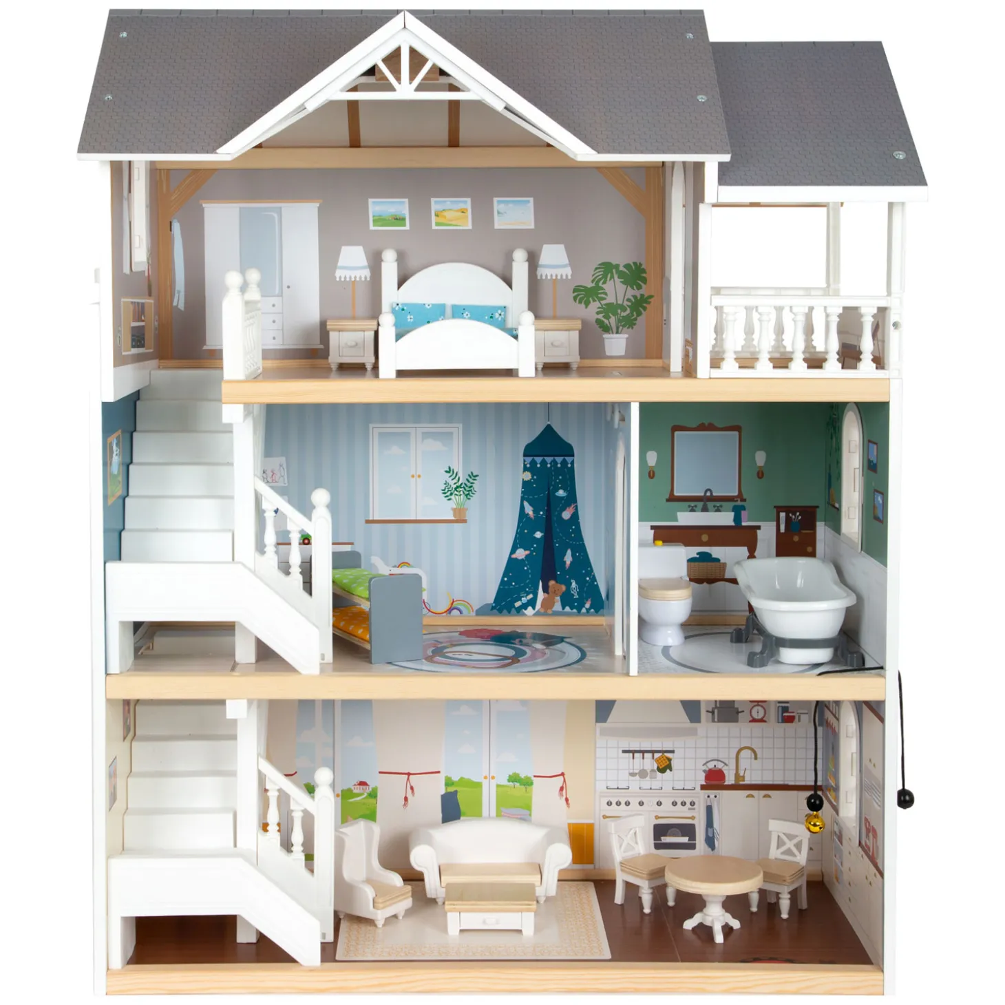 Deze poppenvilla past door zijn lichte buitengevel en moderne kleurstelling perfect in elke woonkamer of kinderkamer. De open voorgevel maakt het spelen makkelijker en zorgt er ook voor dat meerdere kinderen tegelijkertijd met het poppenhuis kunnen spelen. Geschikt voor poppen tot 12 cm.