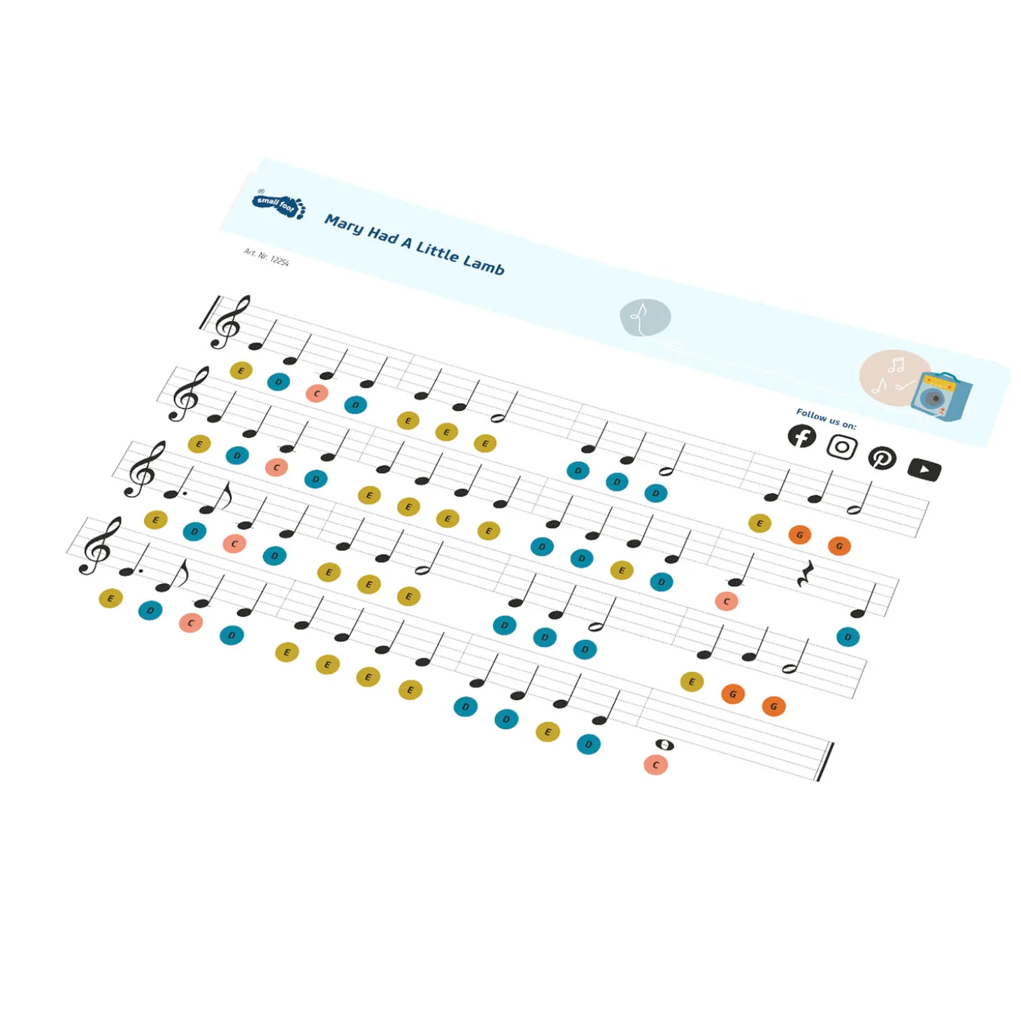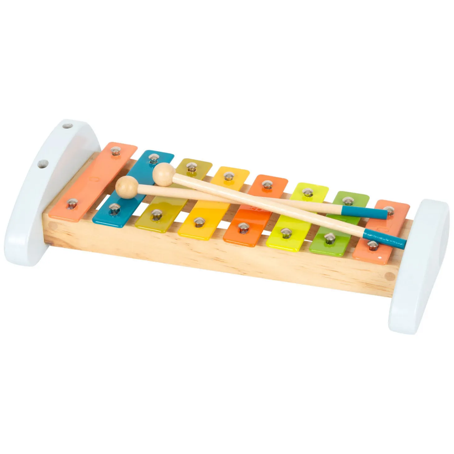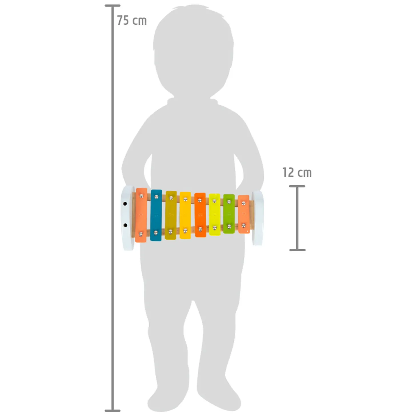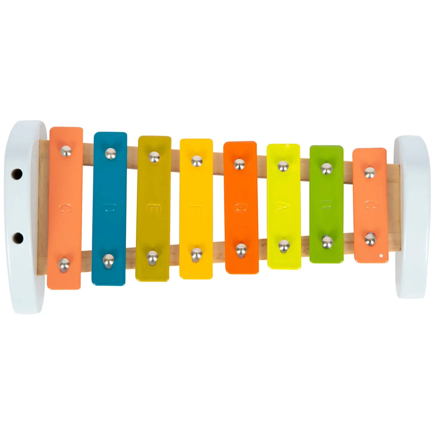 Deze houten xylofoon biedt een ideale introductie in de wereld van geluid! Kinderen hoeven niet eens noten te kunnen lezen om hun eerste liedjes op dit klokkenspel te spelen! De toonbalken zijn kleurgecodeerd en helpen kinderen bij hun eerste muzikale composities samen met de bladmuziek. Wordt geleverd met robuuste hamers van massief hout. Ook voor het kinderkamerorkest is deze xylofoon met zijn zachtblauwe kleuren en moderne, contrasterende kleuren een visuele blikvanger! De xylofoon traint spelenderwijs akoestisch bewustzijn samen met een gevoel voor ritme en maat en een eerste begrip van muzikale tonen en toonladders. Zo kunnen jonge, aspirant-muzikanten hun creativiteit de vrije loop laten.