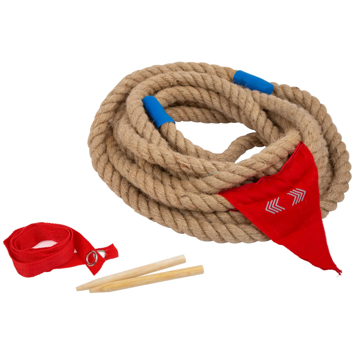 De rode strepen kunnen eenvoudig met houten stokken aan het gazon worden bevestigd en weer eenvoudig worden verwijderd. De kunststof eindkappen aan de uiteinden van het touw zorgen voor een lange levensduur. Het buitenspel zit opgeborgen in een praktische tas met trekkoord.