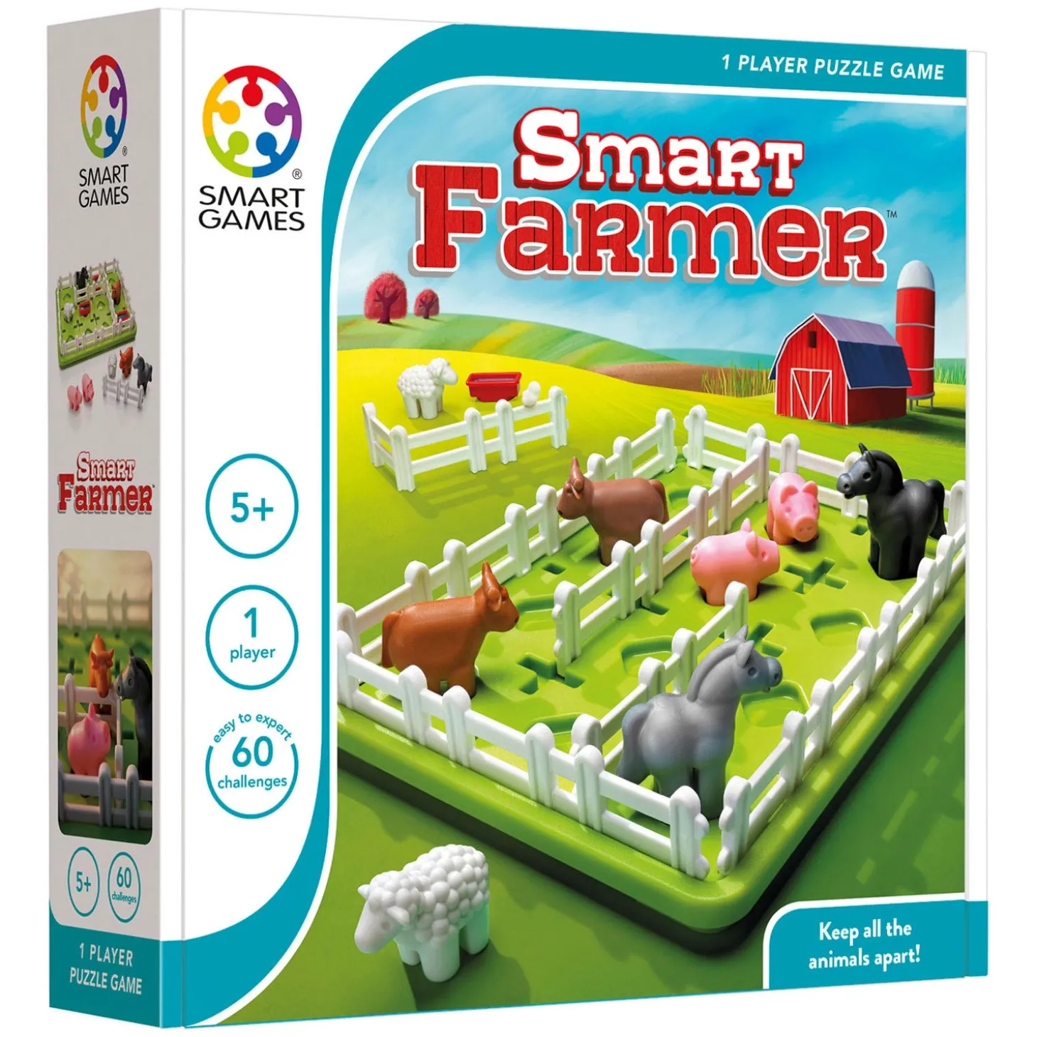 Inhoud: spelbord met 4 vaste hekken, 2 paarden, 2 koeien, 2 schapen, 2 varkens, 3 water troggen, 3 hekken, boekje met 60 opdrachten en oplossingen.