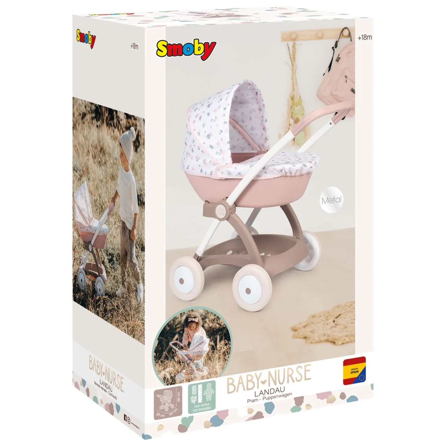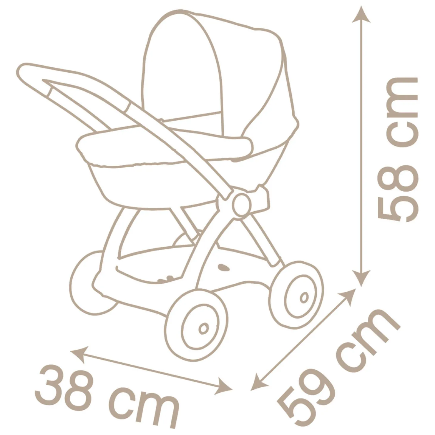 Geschikt voor babypoppen tot 42 centimeter. De handgreep zit op een hoogte van 58 centimeter en de poppenwagen is geschikt voor peuters vanaf 18 maanden. Exclusief pop.