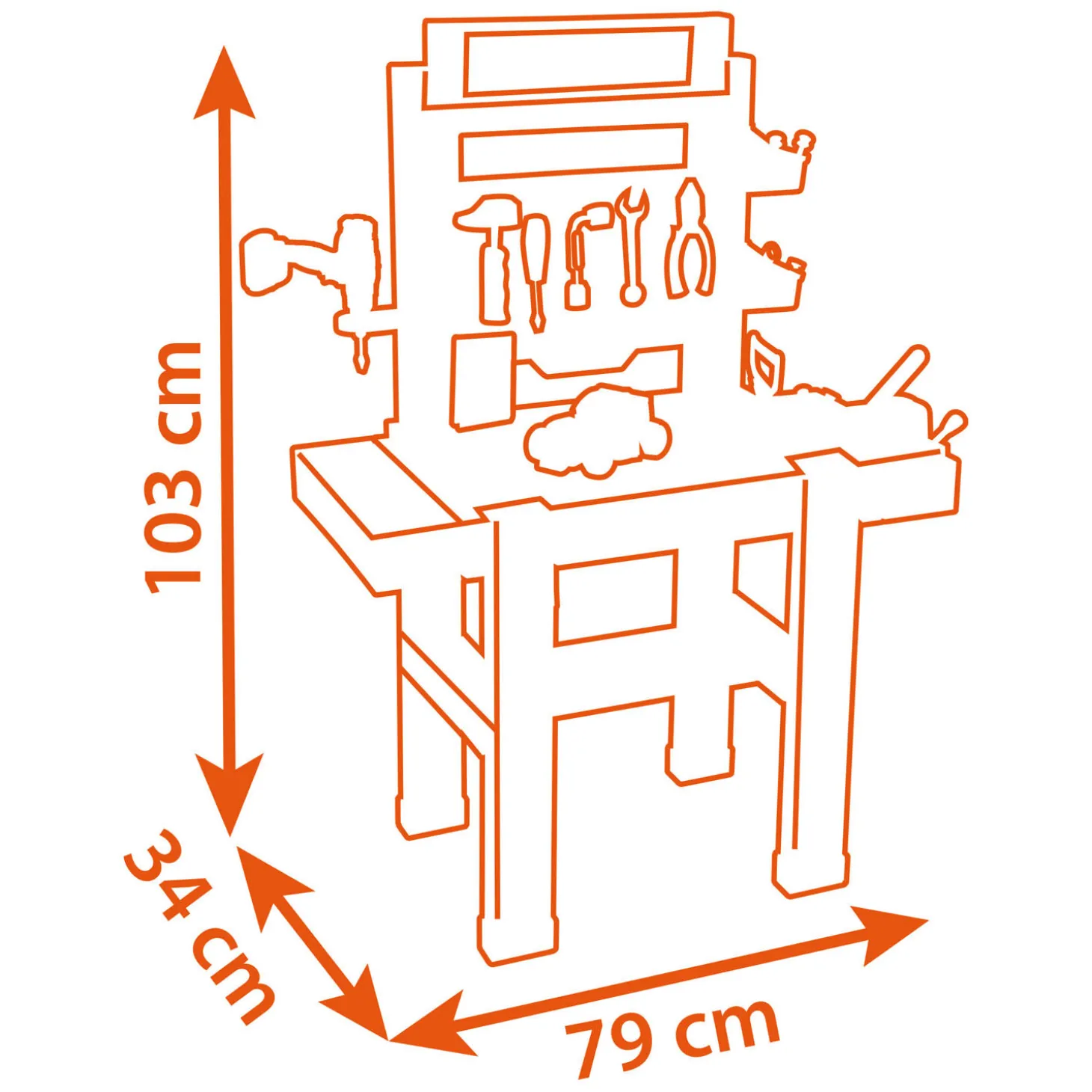 De werkbank bestaat uit 92 accessoires en bevat 7 gereedschappen (zaag, hamer, sleutel, schroevendraaier, tang, waterpomptang, bankschroef), 1 boormachine, schroeven, moeren, spijkers, bouwplaten, 1 mechanische liniaal, en nog veel meer. Alle accessoires vinden hun plaats dankzij de grote opbergruimtes (inclusief 2 bakken) en de 2 extra opbergvleugels!