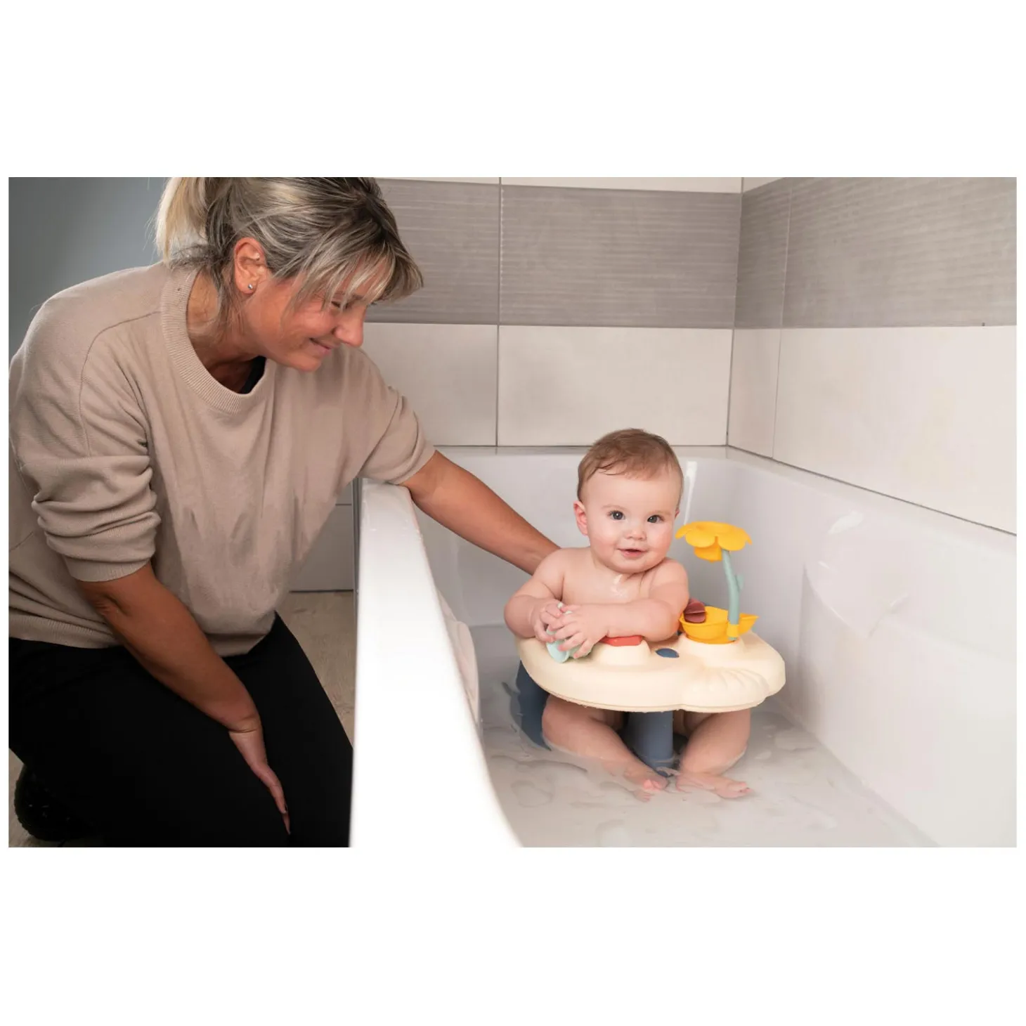 Met een knop schuif je eenvoudig het voorblad van het zitje uit, zodat je je kindje makkelijk in het zitje kan zetten. Dankzij de zuignap onderaan blijft het veilig vaststaan op de bodem van je bad of douche.