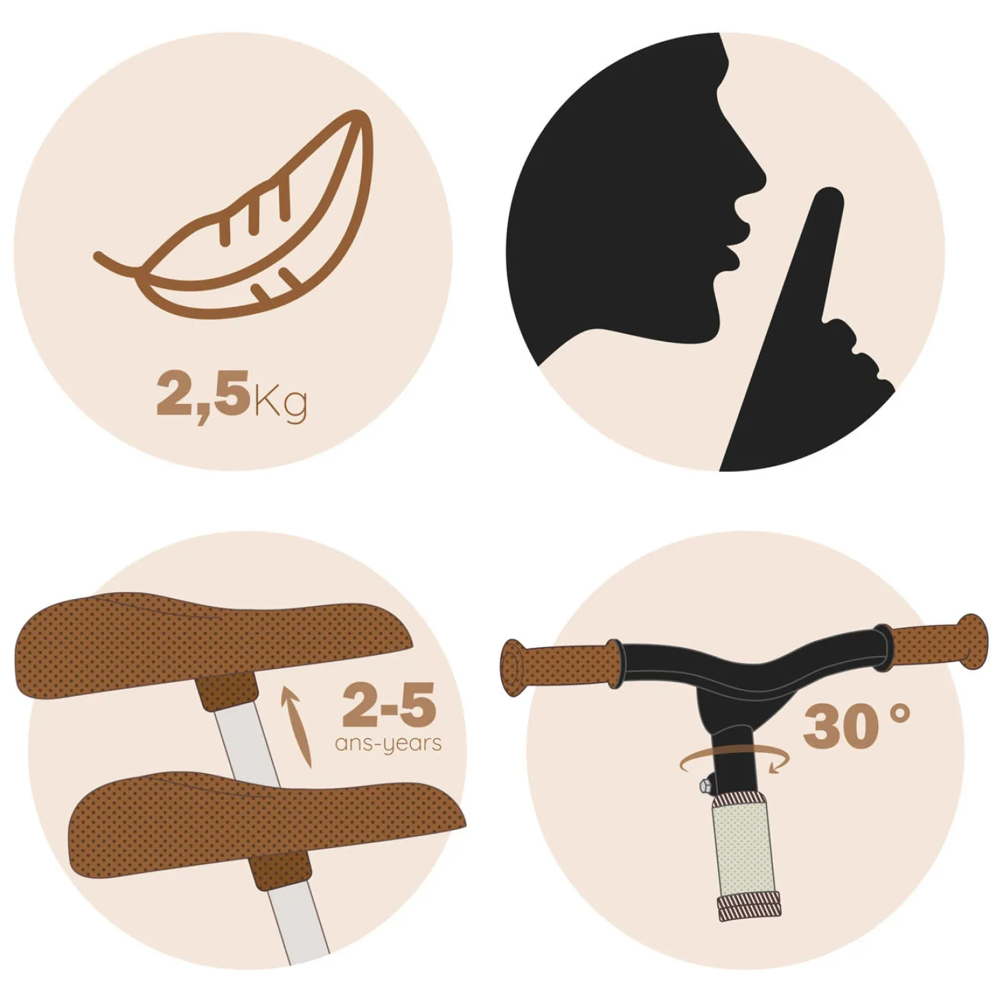 Het stabiele frame van de loopfiets helpt je kind bij het vinden van de juiste balans. De motoriek en het evenwichtsgevoel van kinderen worden versterkt en al spelend leert je kind de eerste basis voor het fietsen. Het zadel is in hoogte verstelbaar en zit comfortabel. Dankzij de geluidsdempende en lekbestendige wielen kan er zowel buitens- als binnenhuis zorgeloos gefietst worden. Het stuur is voor de veiligheid van je kind begrenst en kan draaien in een hoek tot maximaal 30 graden.