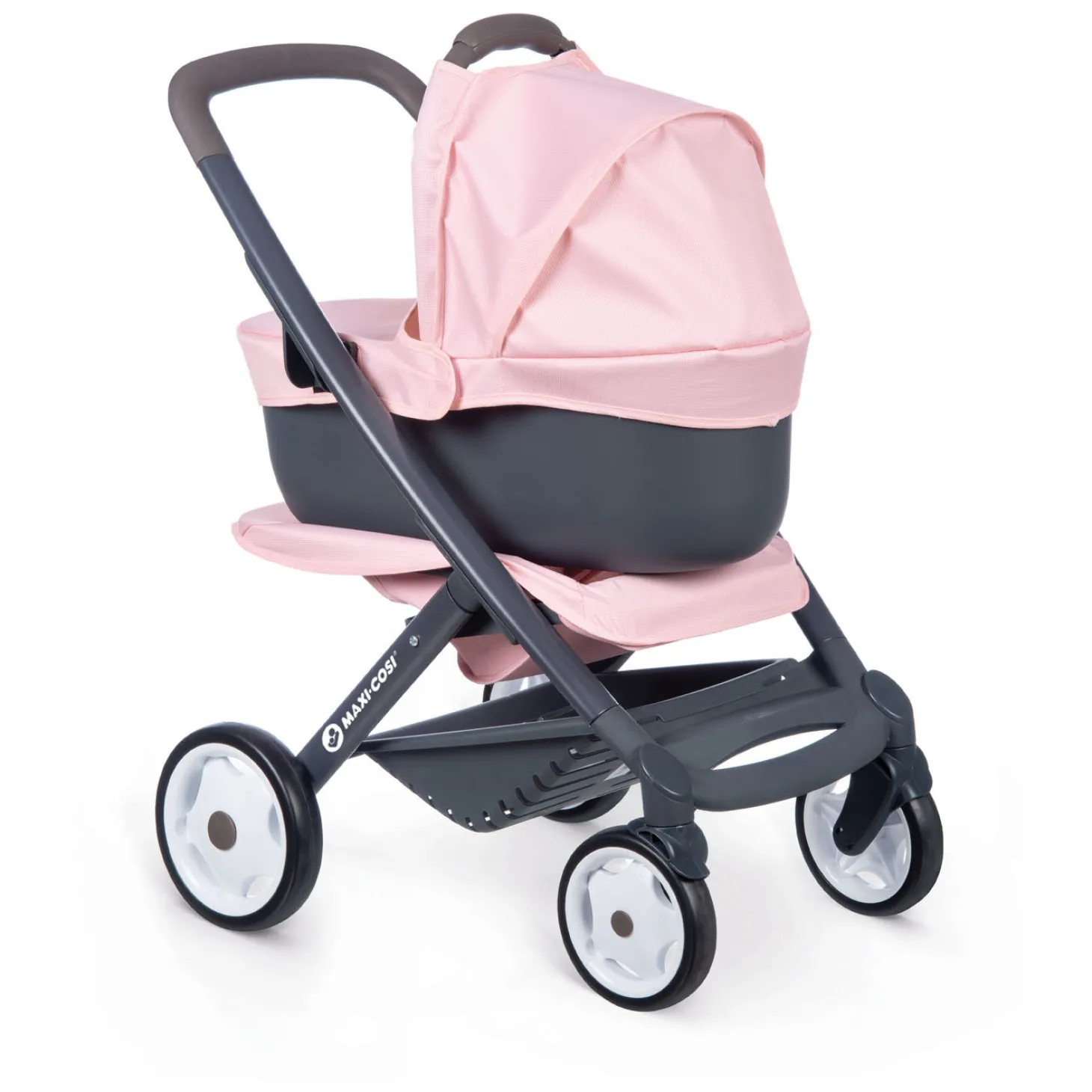 De hoogte van het handvat is 65 centimeter en de maxi-cosi poppenwagen heeft genoeg ruimte voor alle poppen tot 42 centimeter. De zitting is gemaakt van stevig kunststof met een stoffen hoes in zachtroze en de poppenwagen heeft een zwart metalen frame.