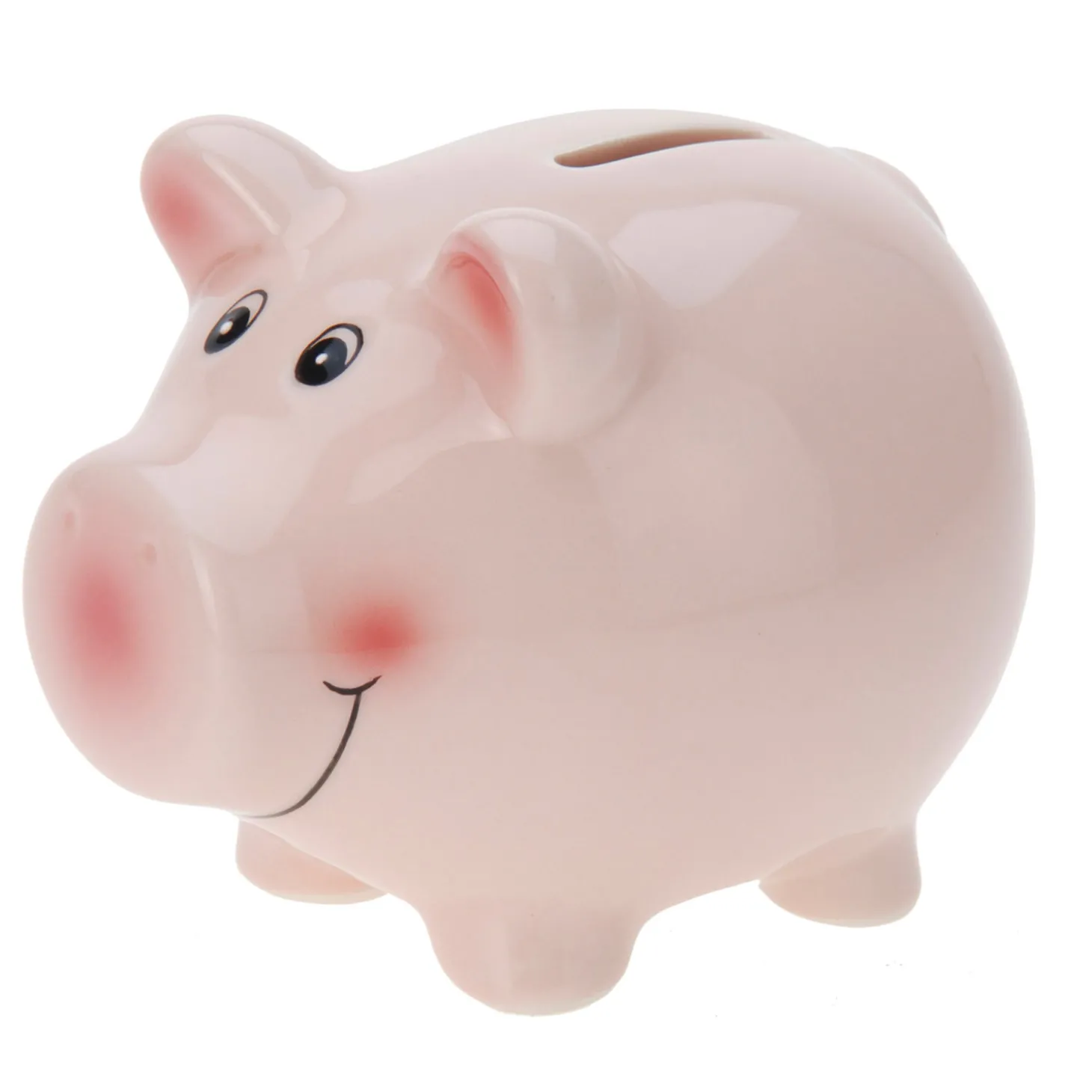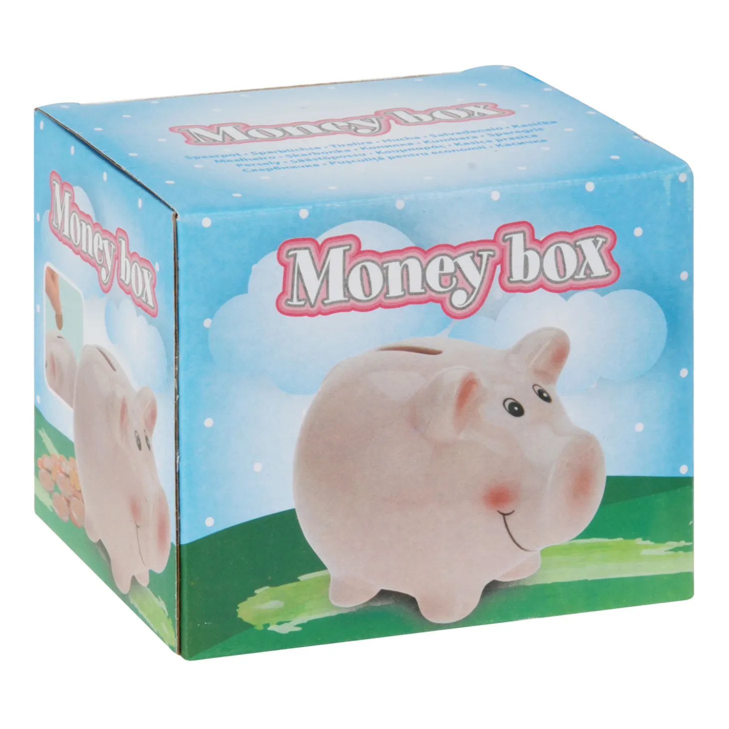 Spaarpot in de vorm van een varken. De spaarpot kan aan de onderkant open/dicht gemaakt worden met een plastic stop.