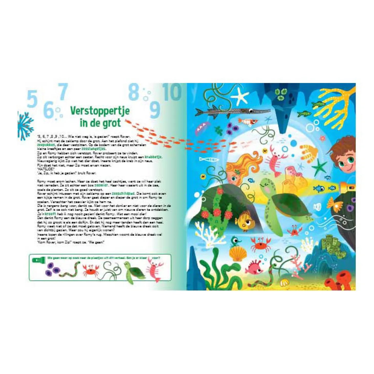 Het boek begint met leuke weetjes en feitjes over de zee. Hier kom je ook de kartonnen zaklamp tegen. Deze zaklamp heb je nodig voor de pagina’s die volgen. In het verhaal staan namelijk gekleurde woorden, die je op de rechterpagina kunt zoeken. Maar dat lukt alleen als je de zaklamp gebruikt! Schuif ‘m onder de zwarte pagina en je ziet dat er een lichtbundel ontstaat, waarmee je kunt zien wat Romy en Rover allemaal beleven. Bekijk je ook de andere titels in deze serie?