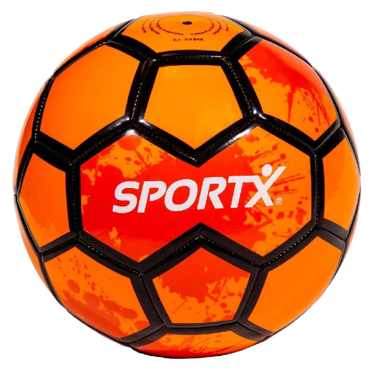 SportX Splash voetbal, in oranje kleurstelling met zwarte accenten. Gewicht: 330-350 gram. Materiaal: super shiny pvc. Diameter: 22 cm. Dikte van de lagen: 2,7 mm. Wordt onopgeblazen geleverd.