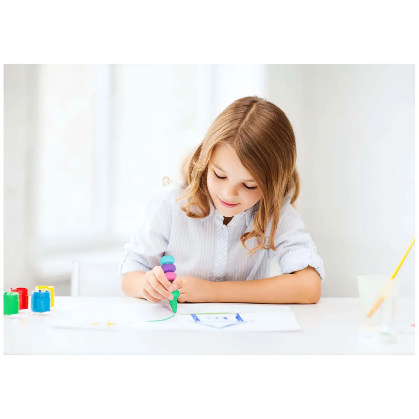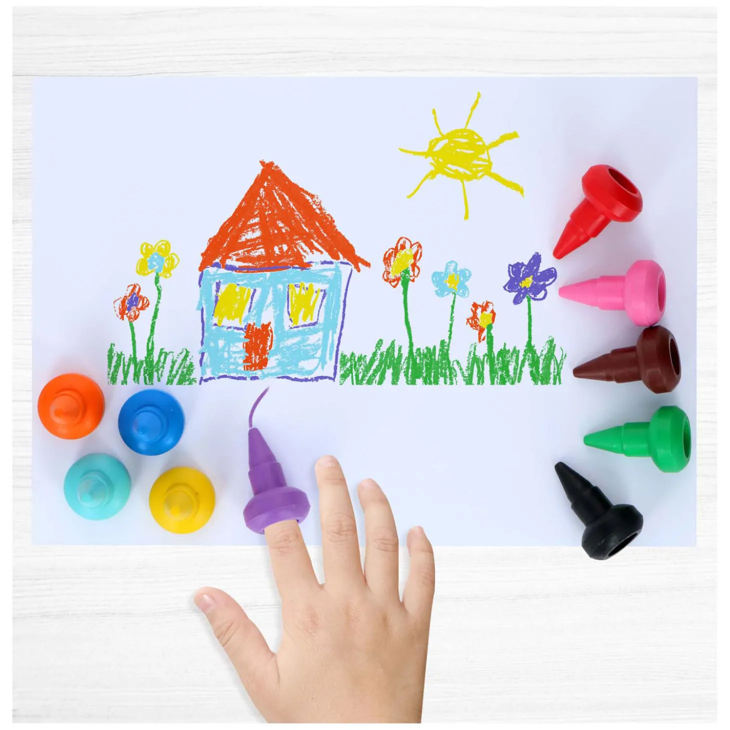 Stapelbare vingerwaskrijtjes. In de verpakking zitten 10 waskrijtjes die je op je vinger kunt bevestigen om zo de mooiste tekeningen te maken. De krijtjes zijn ook stapelbaar, waardoor je ze als pen kunt vasthouden. In de kleuren: zwart, bruin, groen, blauw, paars, rood, roze, geel, aqua en oranje. Geschikt voor kinderen van 3 jaar en ouder.