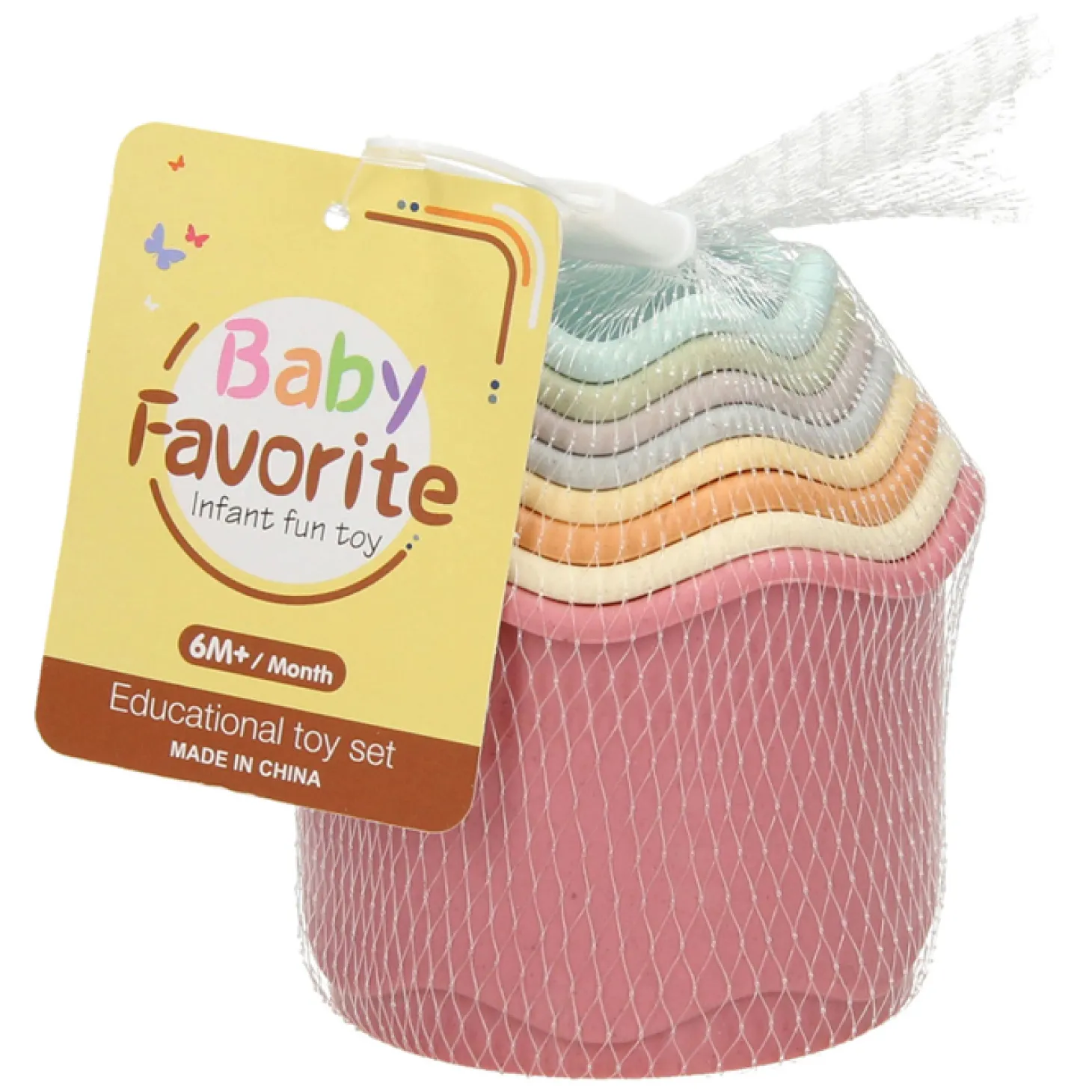 Set met 8 pastelkleurige stapelbekers voor baby’s. De stapelbekers hebben zachte kleuren en een golvende rand. Alle 8 bekers hebben een ander formaat, waardoor ze zowel op- als in elkaar te stapelen zijn. Een leuk spelletje dat de handmotoriek en hand-oogcoördinatie helpt ontwikkelen! Geschikt voor kinderen van 6 maanden en ouder.