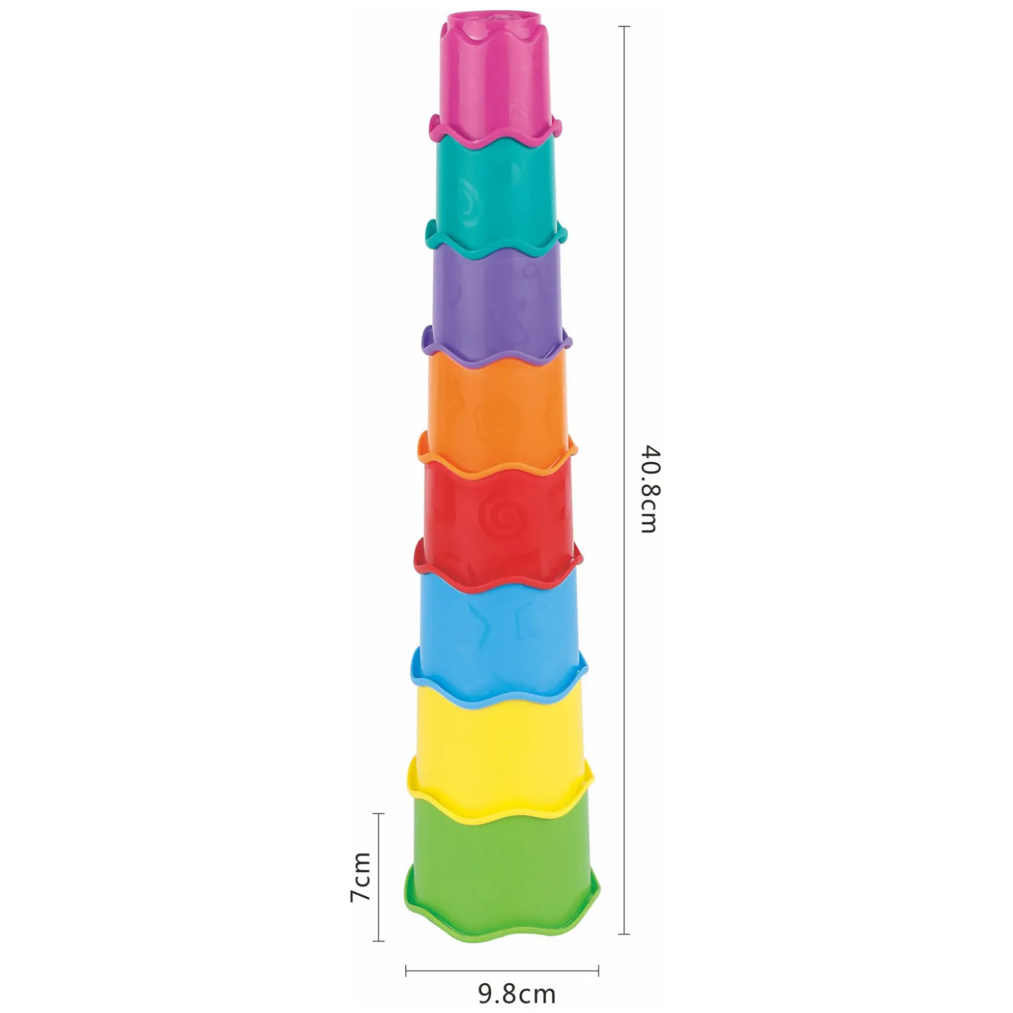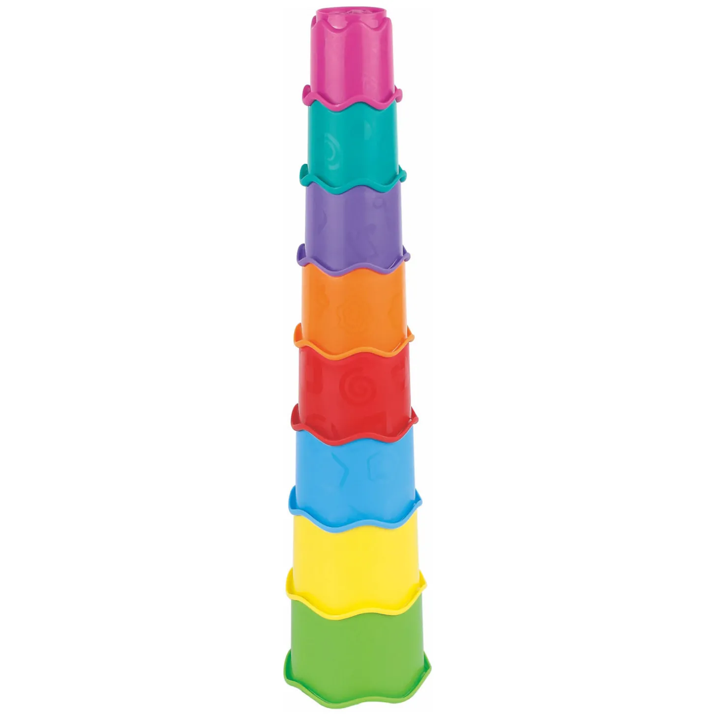 Het stapelen van bekertjes is een klassieke baby-activiteit die de handmotoriek en hand-oogcoördinatie verbetert. Deze kleurrijke set maakt een stapeltoren van 8 bekers in verschillende maten. De bekers hebben opstaande randjes voor stabiliteit en op de onderkant in reliëf een afbeelding van diverse dieren. Geschikt voor baby’s en kinderen vanaf 6 maanden oud.