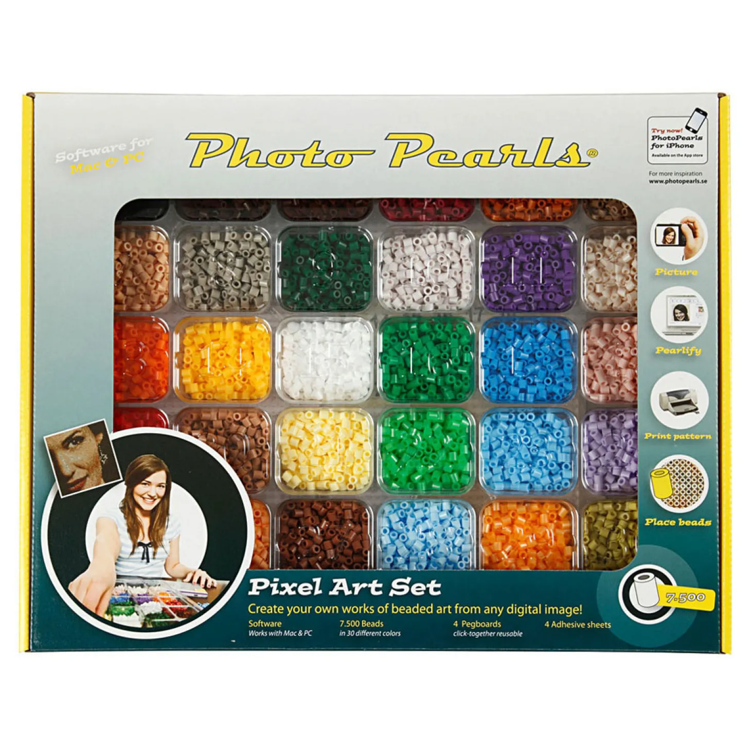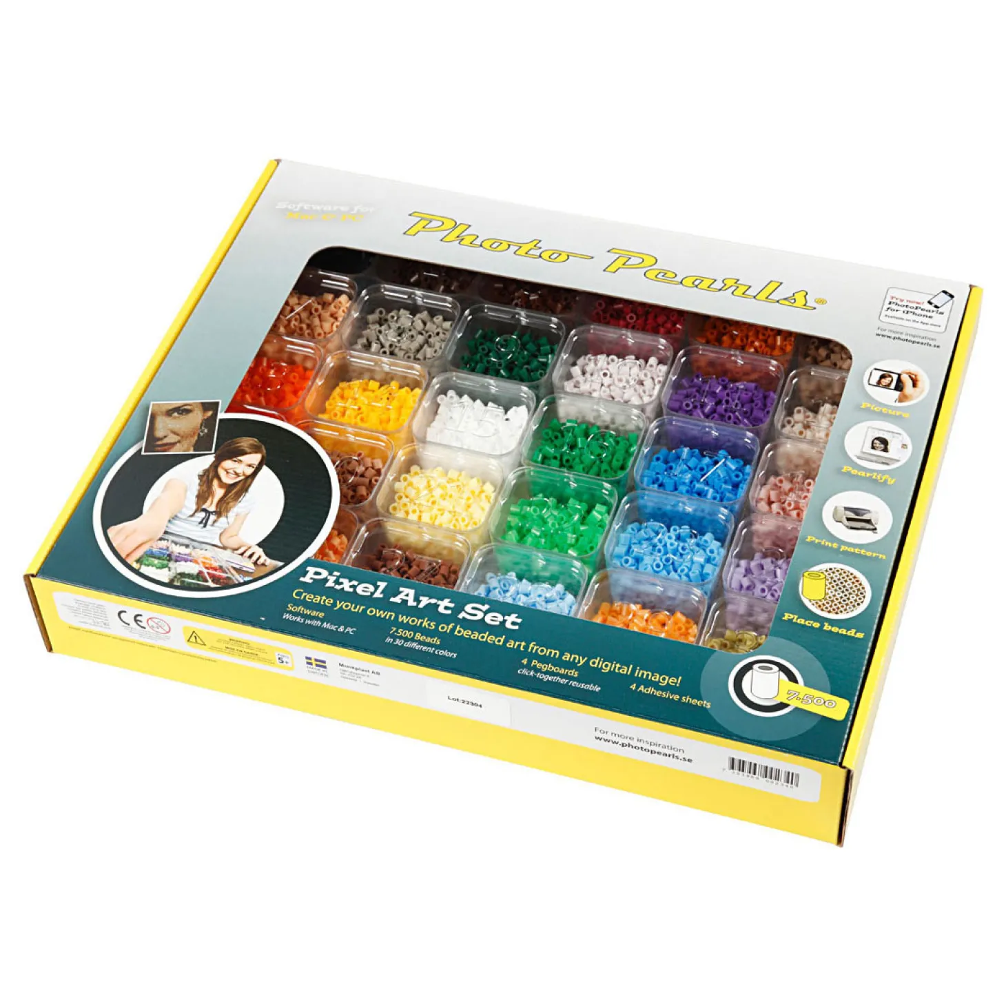 Deze set bevat originele Nabbi Foto kralen voor het maken van foto afbeeldingen m.b.v. een computerprogramma.Inhoud: 7500 Nabbi FotoKralen (30 verschillende kleuren), 4x onderplaat (15×15 cm), 4 zelfklevende vellen