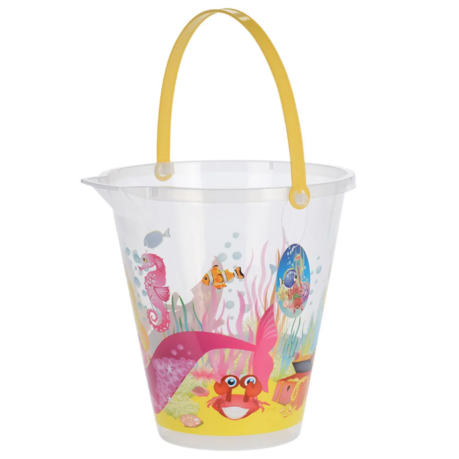 Verplaats water of zand met deze vrolijke strandemmer. De transparante emmer heeft een print van de onderwaterwereld rondom en een felgekleurd handvat. Dankzij de schenktuit aan de rand giet je het water of het zand gemakkelijk weer uit de emmer.