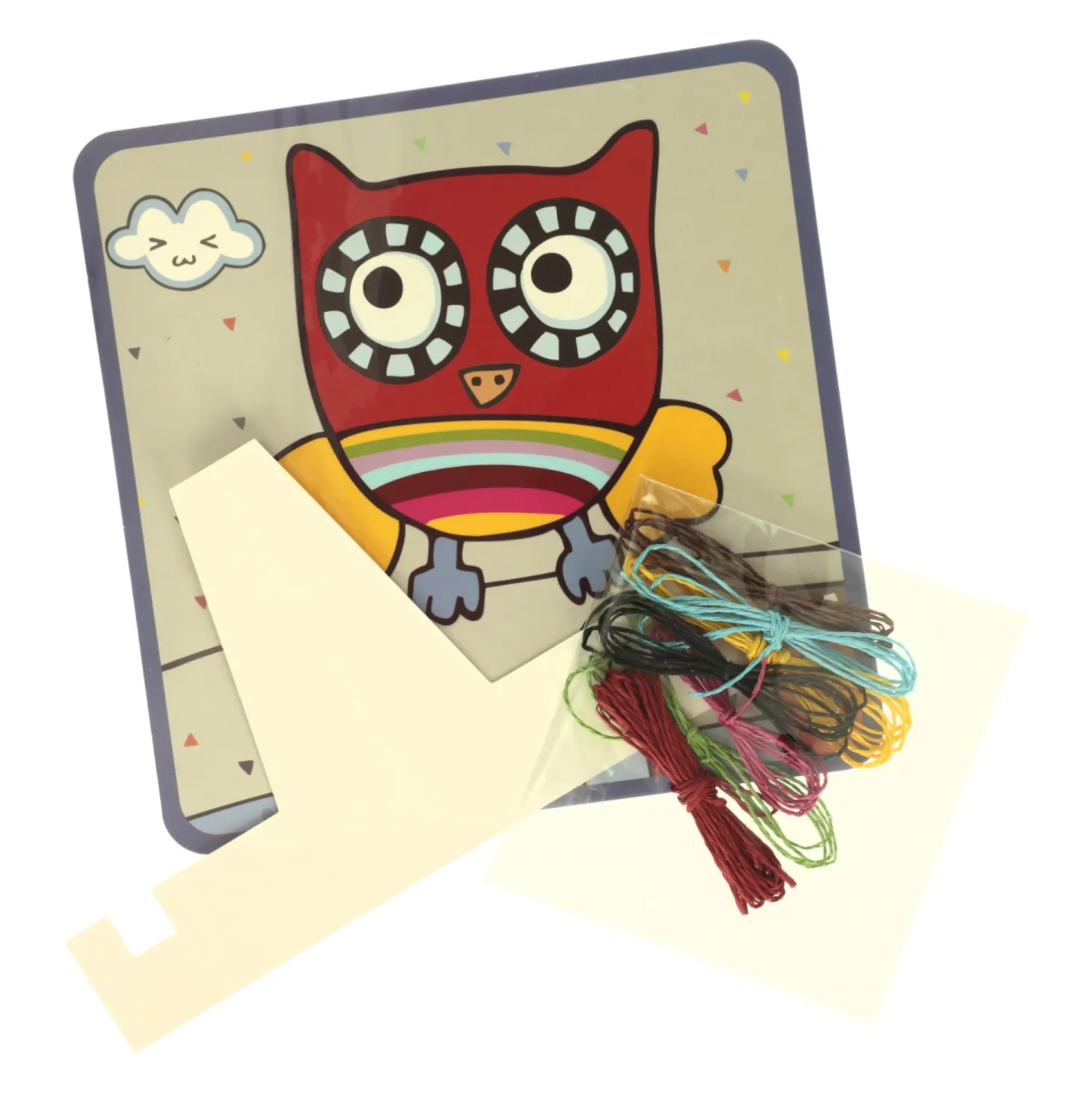 Het schilderij is 22 x 22 cm groot. De verpakking bevat de kartonnen afbeelding, verschillende kleuren touw en een kartonnen houder. Geschikt voor kinderen vanaf 3 jaar.