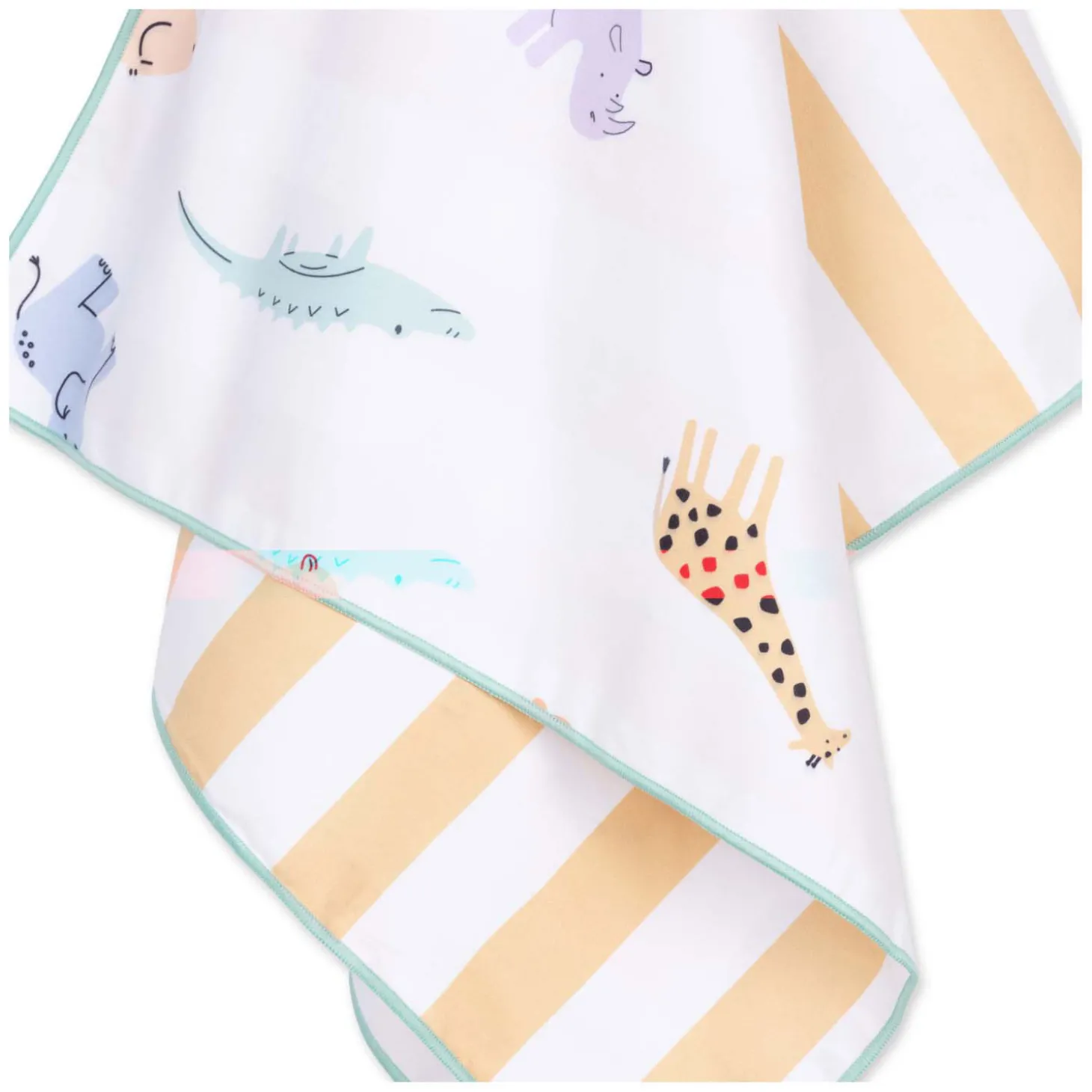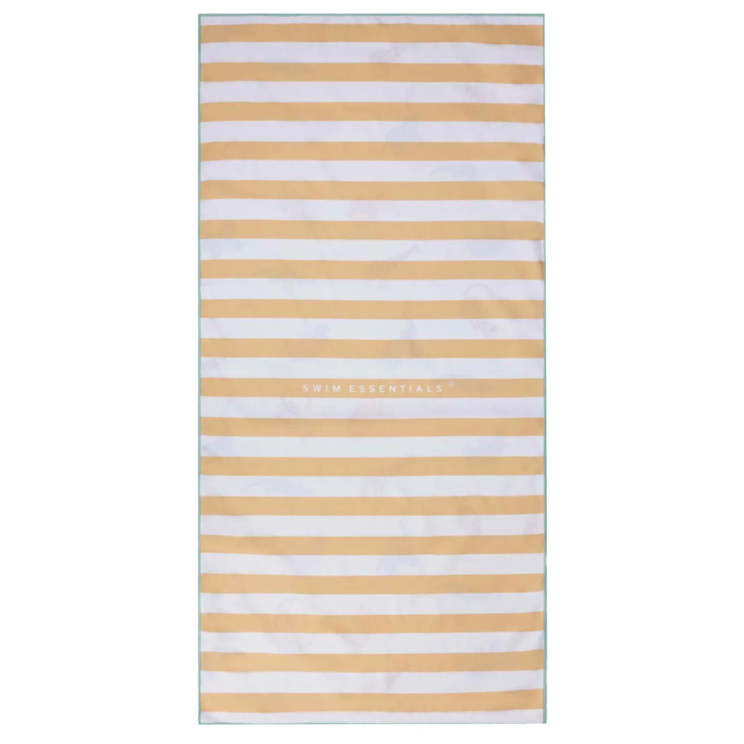 Het strandlaken heeft twee kanten, waardoor je altijd kunt kiezen welke stijl het beste bij je past. De ene kant is voorzien van een opvallende Safari print, perfect voor liefhebbers van dieren, terwijl de andere kant is uitgevoerd in frisse oranje-witte strepen voor een klassieke, zomerse look.