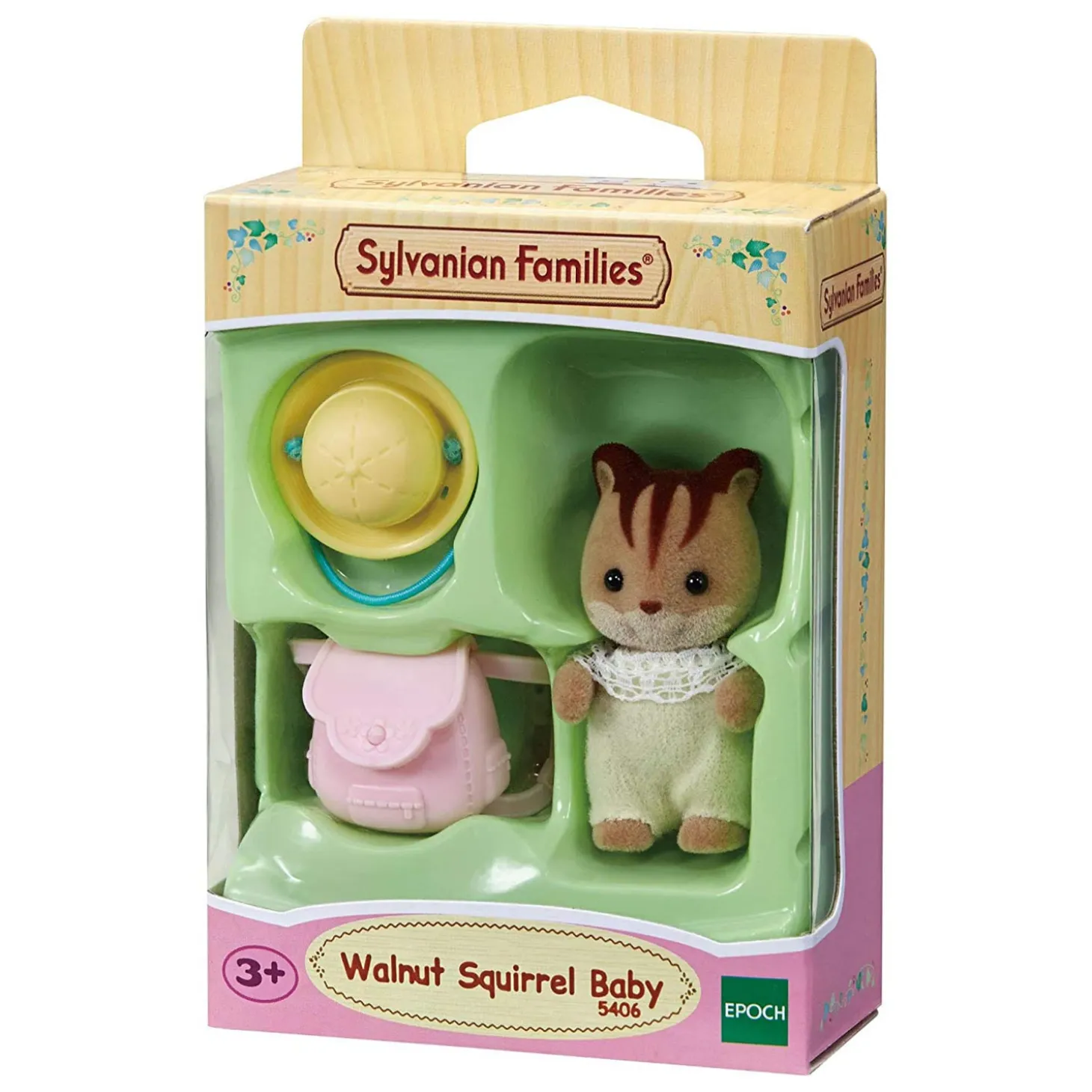 De Sylvanian Families 5406 Baby Walnoot Eekhoorn set bevat een baby eekhoorn, hoed en rugtas. Geschikt voor kinderen vanaf 3 jaar.