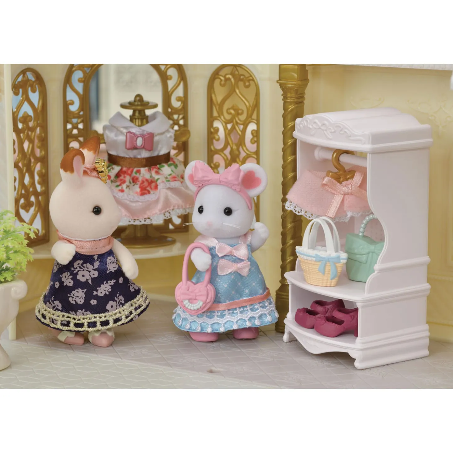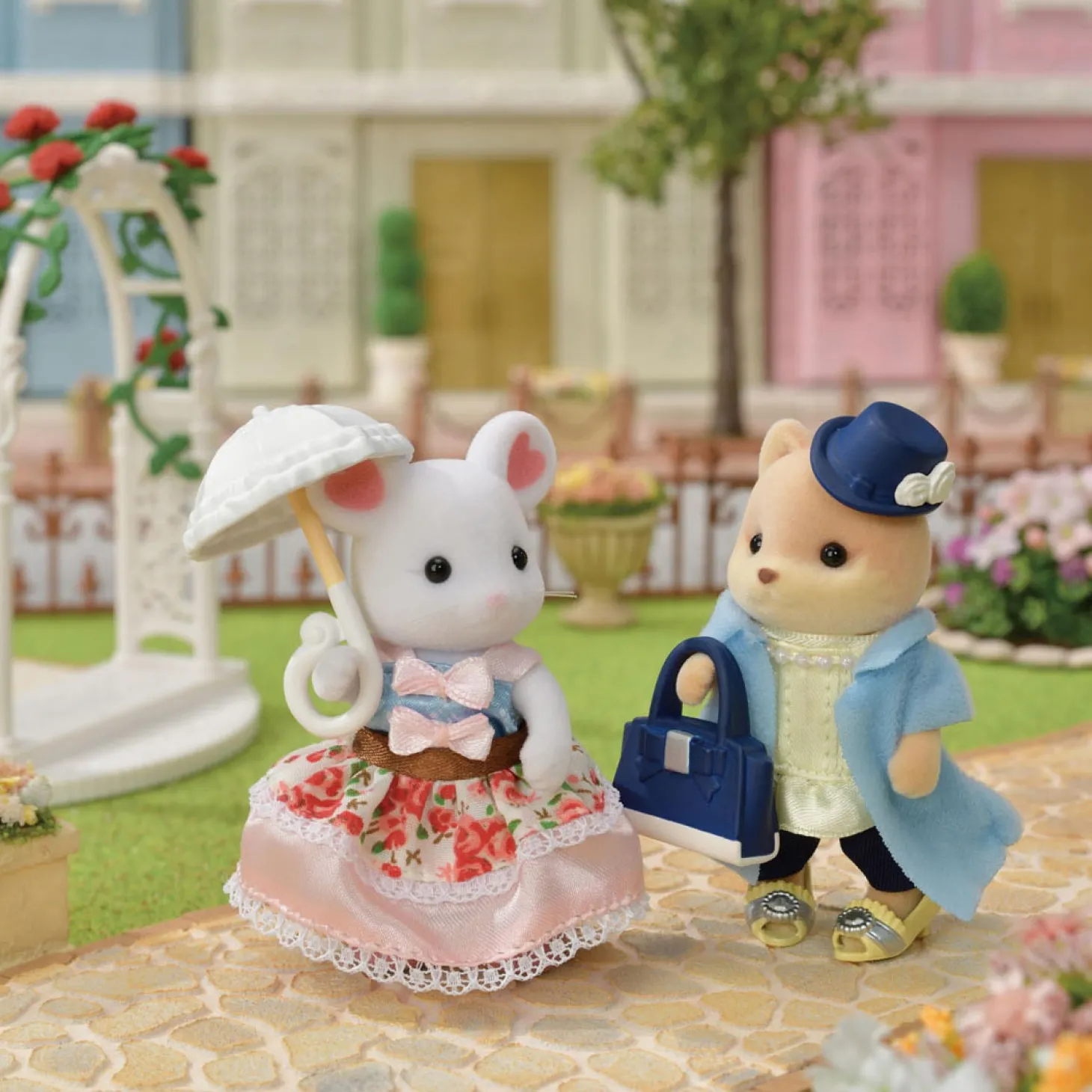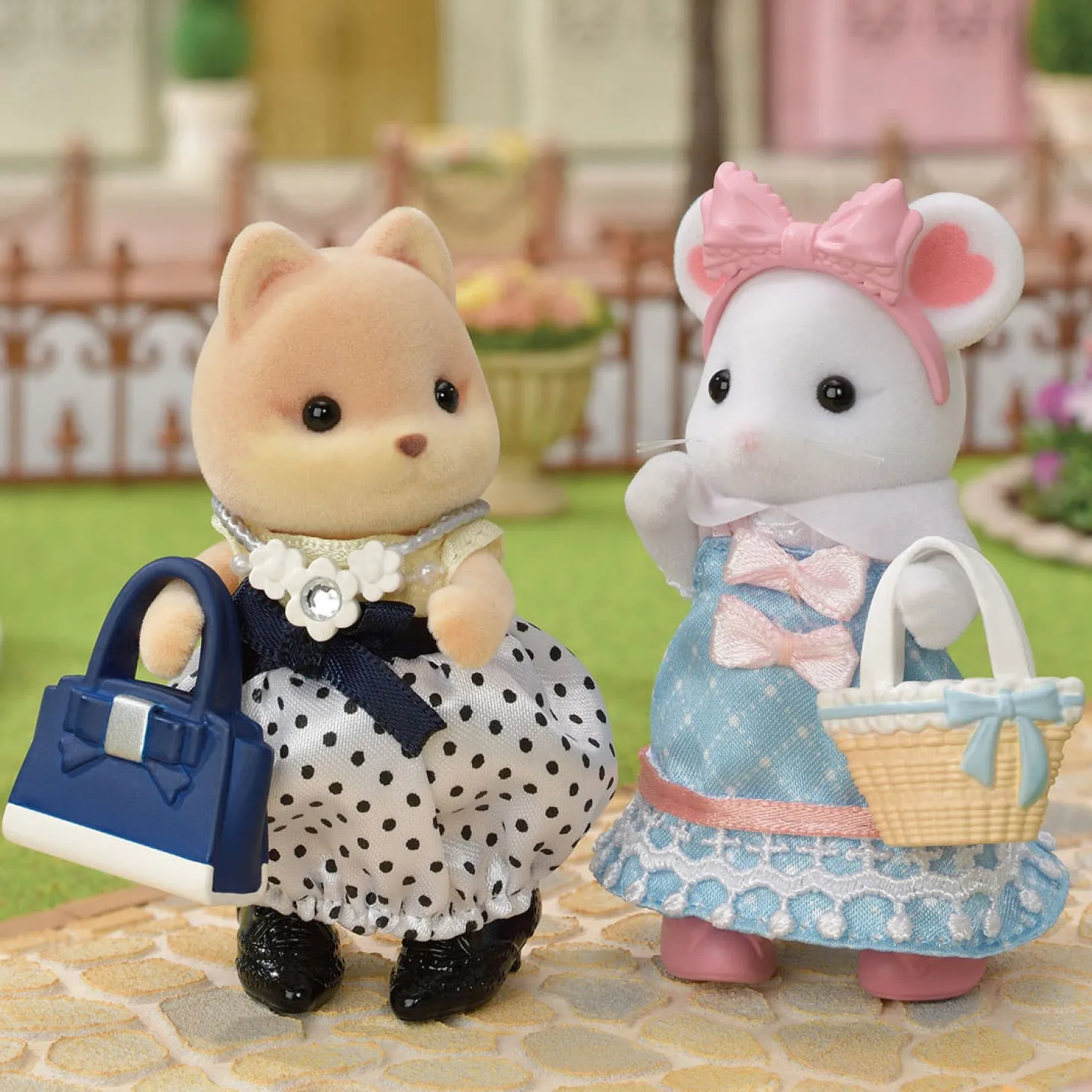 Grote zus marshmallow muis, blouse, rok, cape, parasol, pumps, ketting, haarband, handtas, mand, kledinghanger, kledingrek (in totaal 12 onderdelen)
