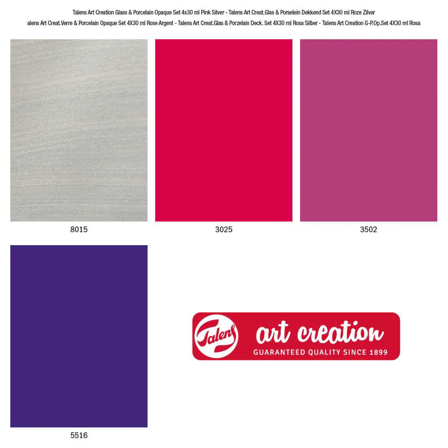Inhoud: 4x30ml (8015 Blinkend Zilver – 3025 Intens Karmijn – 3502 Helder Fuchsia – 5516 Magisch Paars).