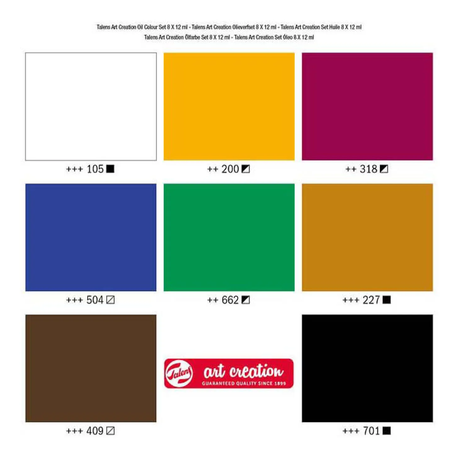 Deze olieverfset van 8x12ml tubes biedt een goed basispalet aan kleuren om verschillende schilderijen mee te maken. Door de handige maat zijn deze tubes ideaal om in je studio te hebben of om mee op reis te nemen. Talens Art Creation biedt ook sets van 12 en 24 tubes en een startersset met alles wat je nodig hebt om aan de slag te gaan met olieverf.