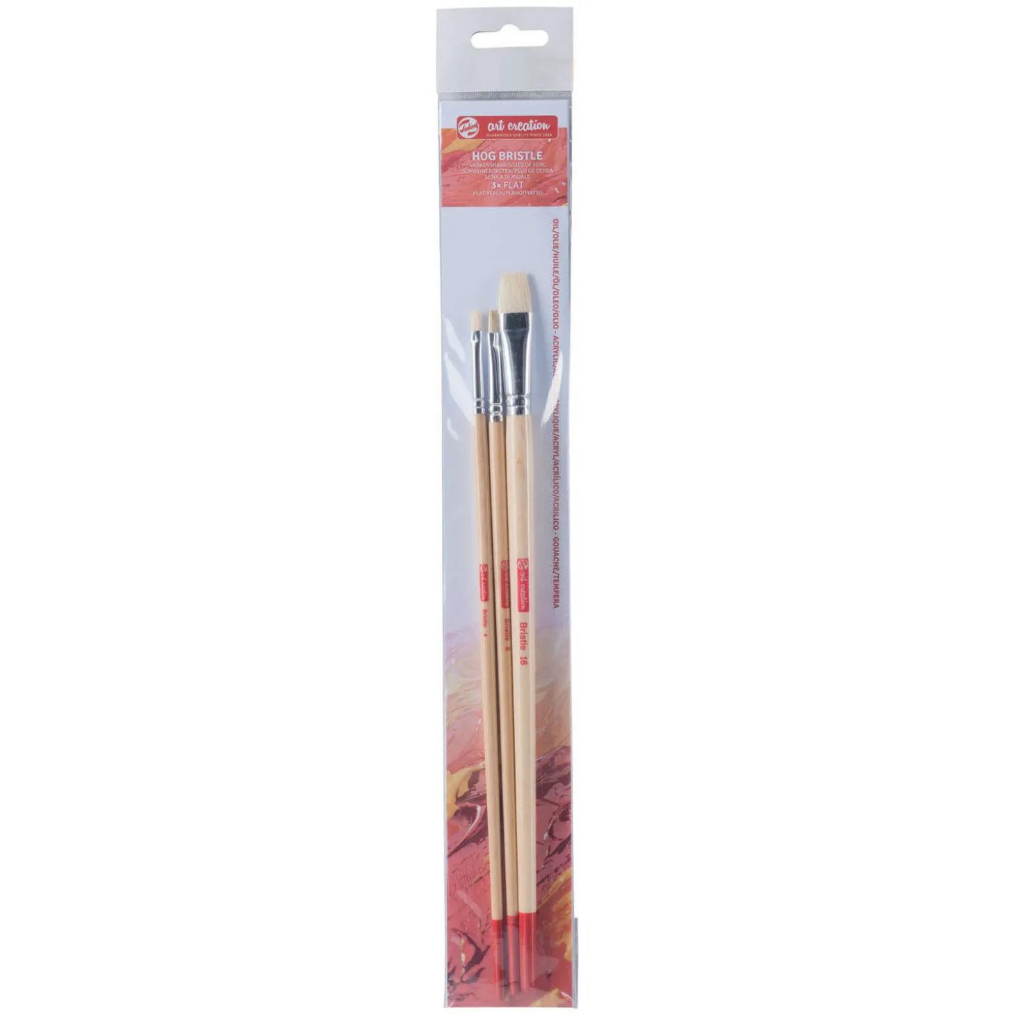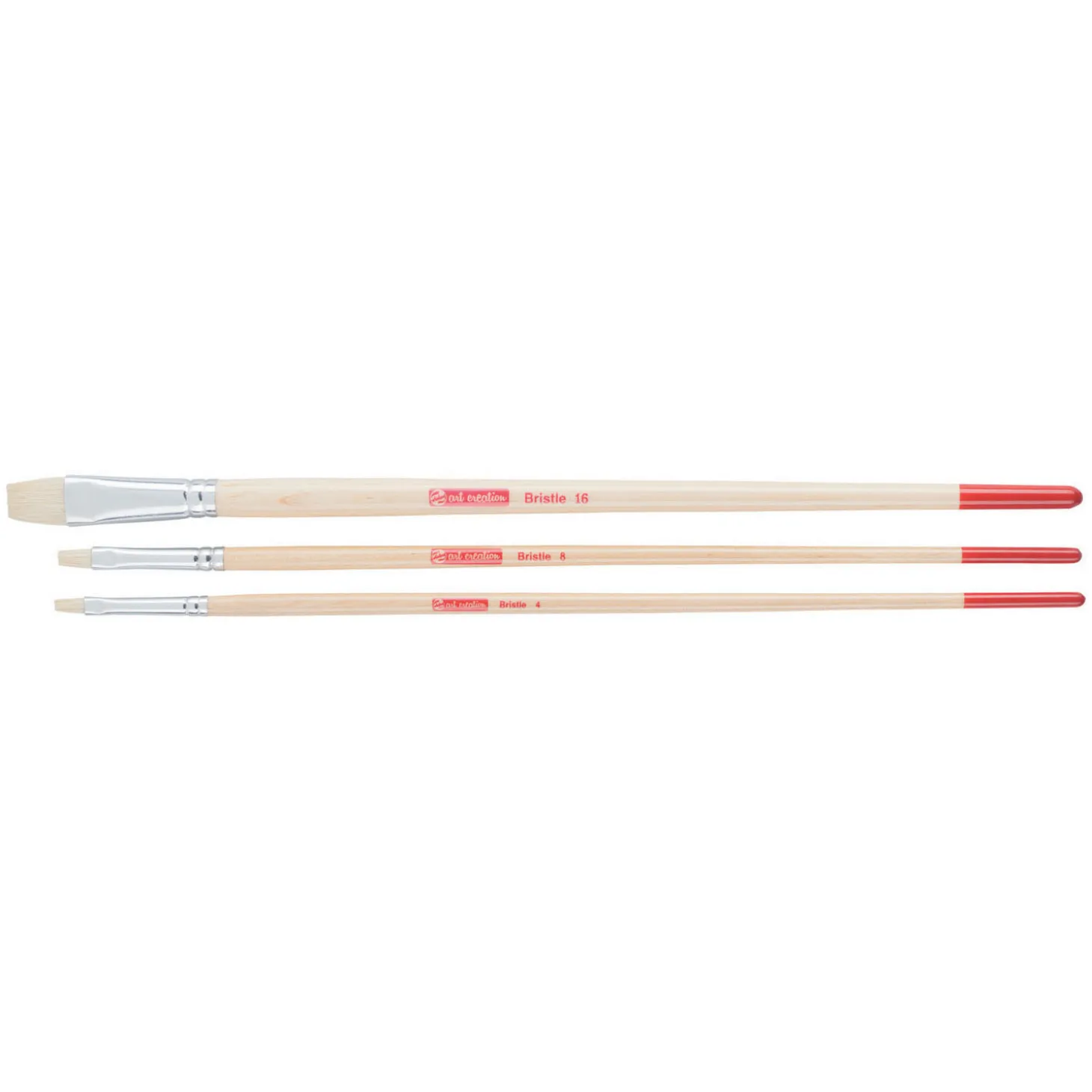 Set van 3 platte penselen in de maten 4, 8 en 16. De penselen zijn gemaakt van stevig varkenshaar en geschikt voor grote vlakken en vlakke verftoetsen.