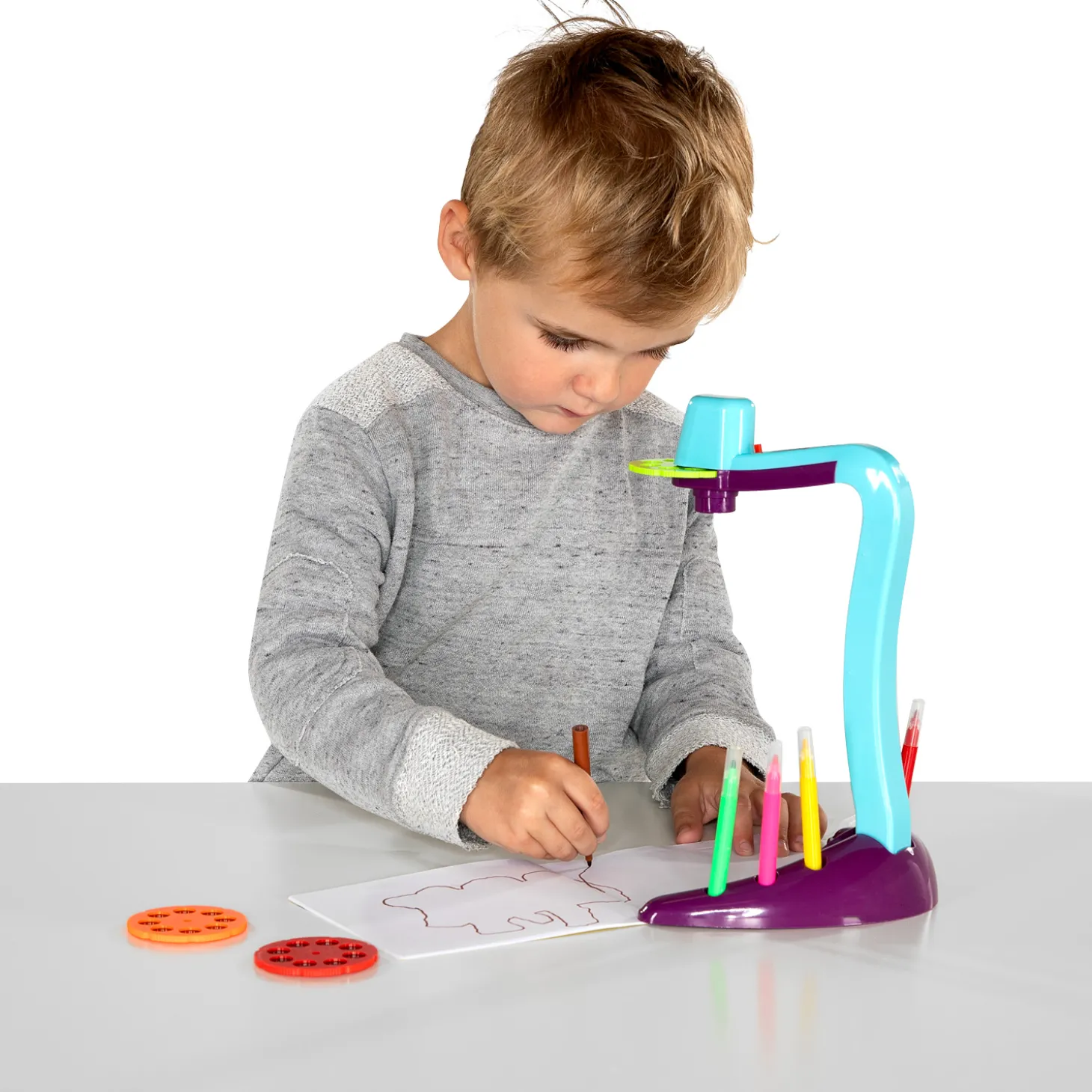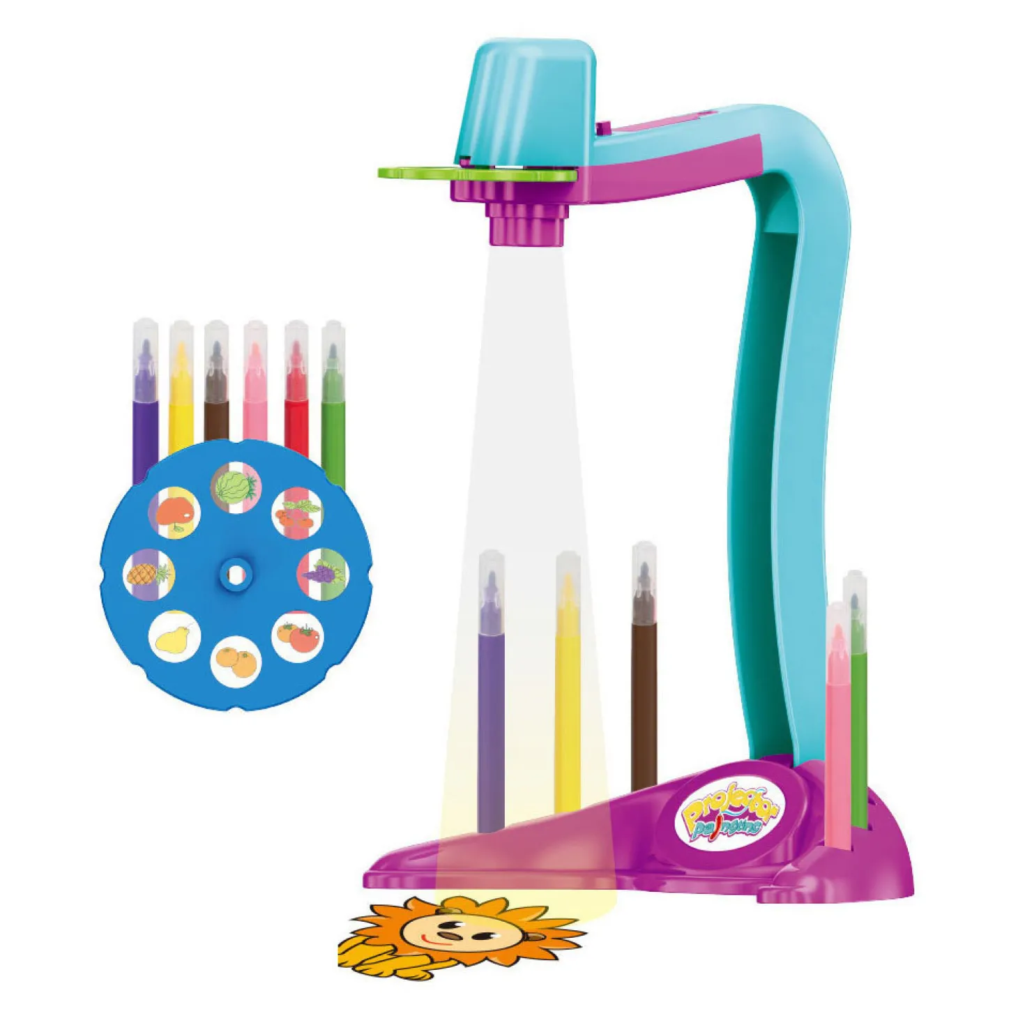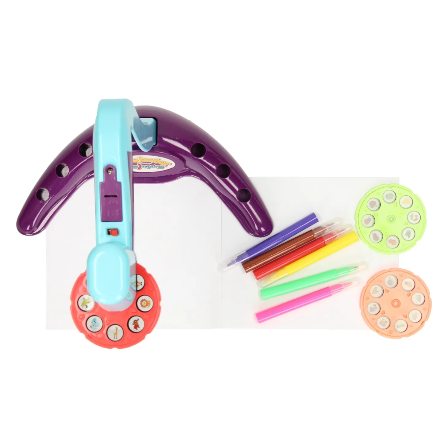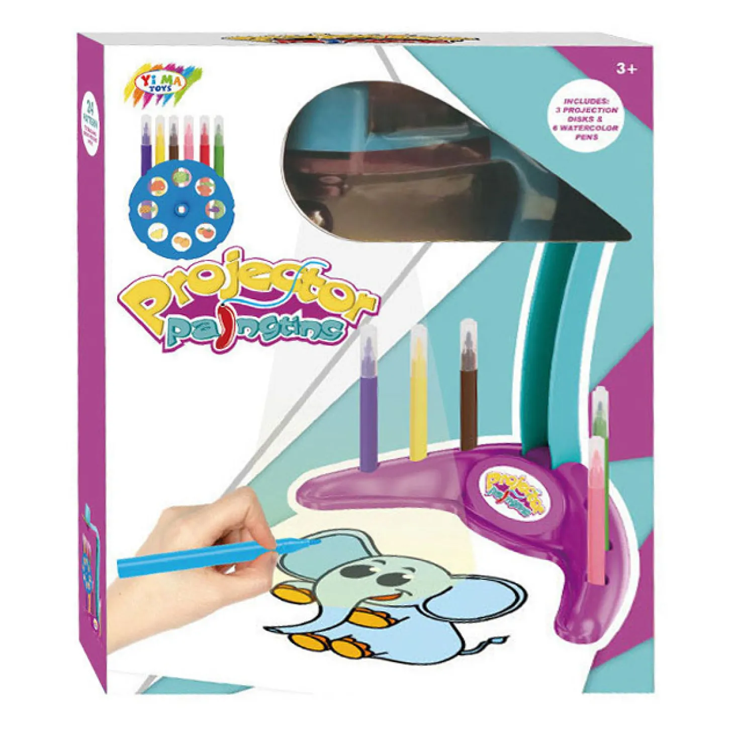 De projector is geschikt voor kinderen vanaf 3 jaar. In de verpakking zit de projector, 3 schijfjes, 1 kleurboekje en 6 stiften. De projector is 20 x 13 x 28 cm groot.