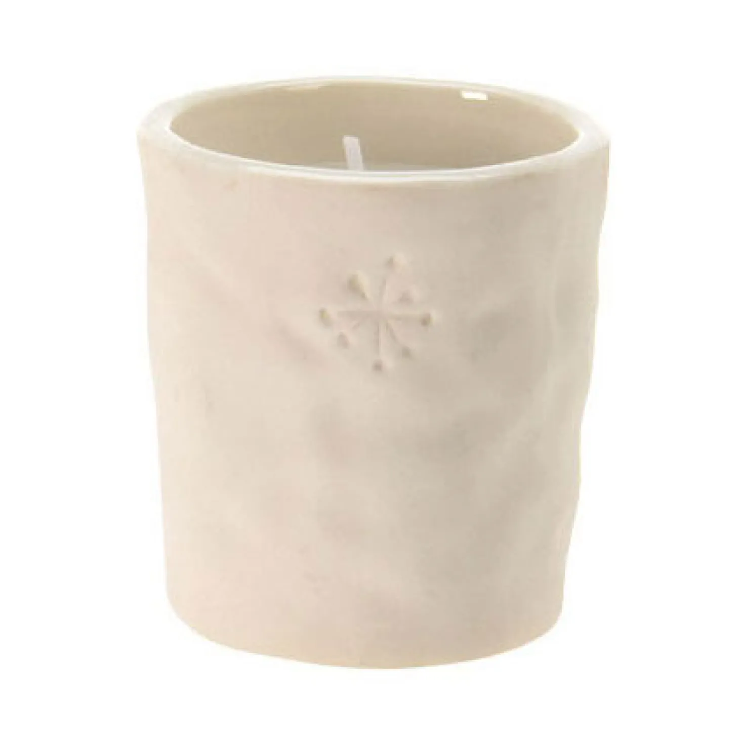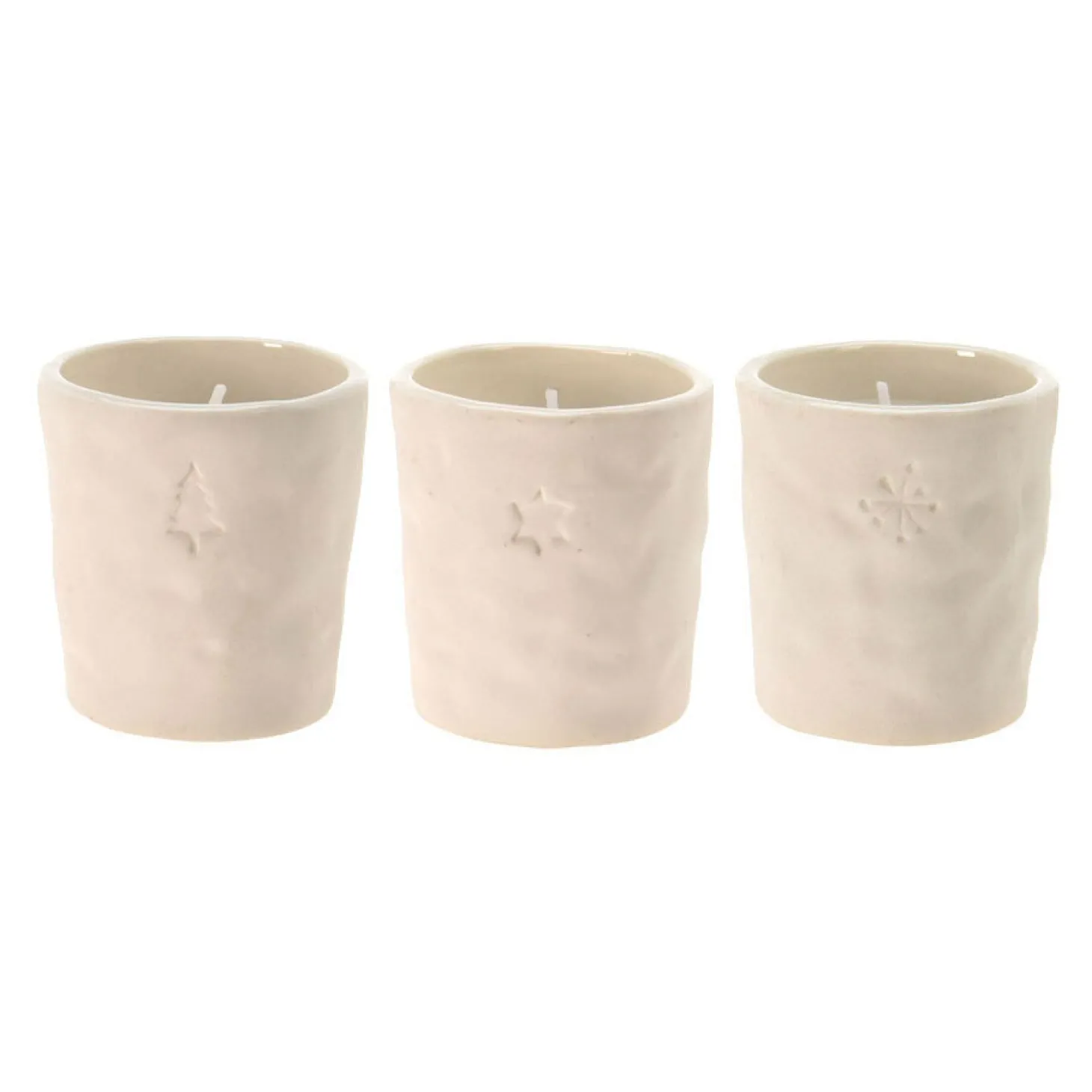 Mooie 12-delige set met kaarsen in porseleinen potje. De eenvoudige, rustiek vormgegeven potjes hebben een subtiele inkerving van verschillende kerstfiguren. Elk kaarsje is ca. 5,5 centimeter hoog.