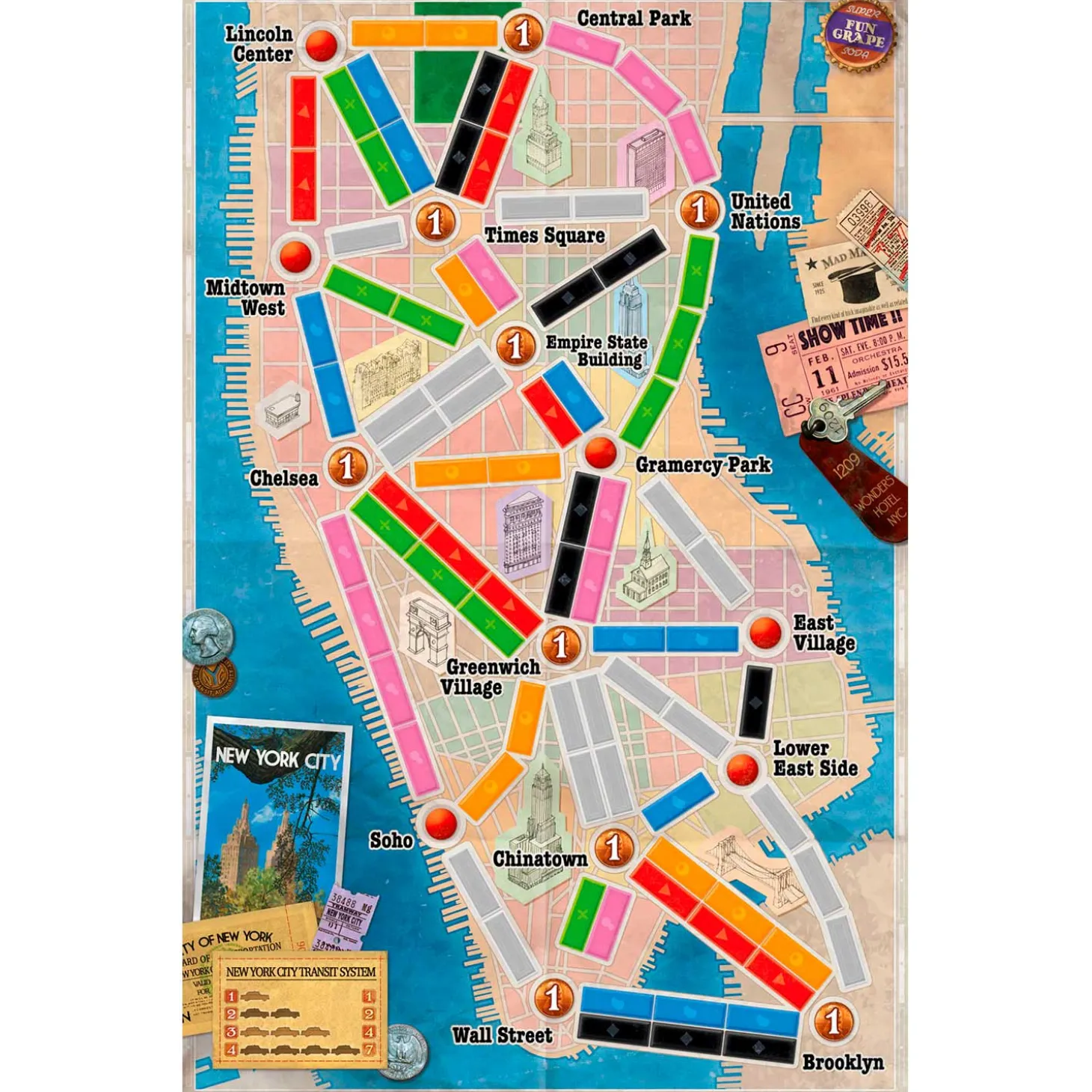 Tijdens deze kortdurende variant uit de Ticket to Ride spellenreeks racen de spelers tegen elkaar in de drukke straten van New York City om de meest prestigieuze locaties te bezoeken en om hun bestemmingskaarten te voltooien. Voor het bezoeken van een aantal locaties zijn bonuspunten te verdienen, waardoor jouw rit door New York nog spannender wordt.