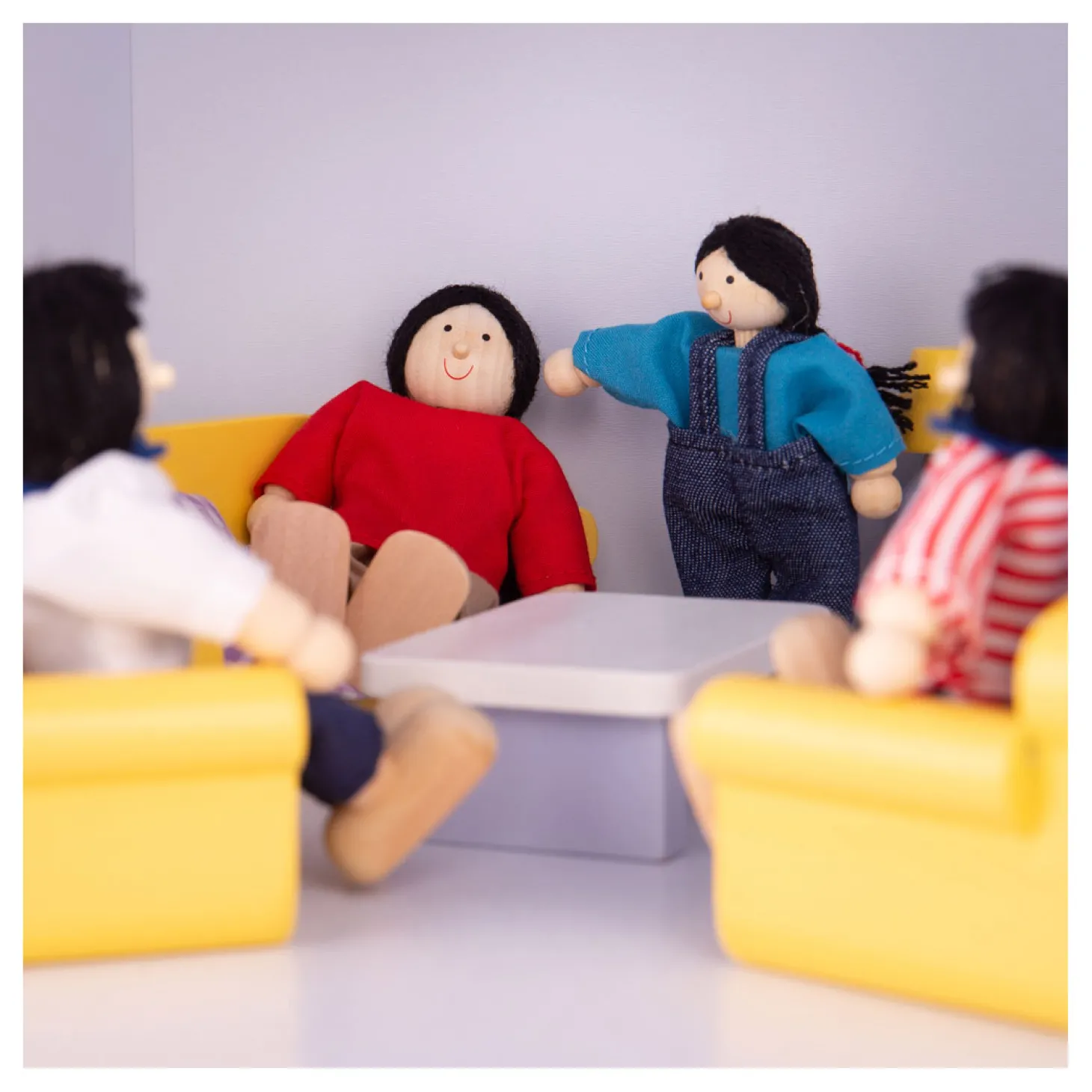– Bestaat uit: poppenbankstel, poppenfauteuils, tv-meubel met tv en lamp, poppensalontafel.