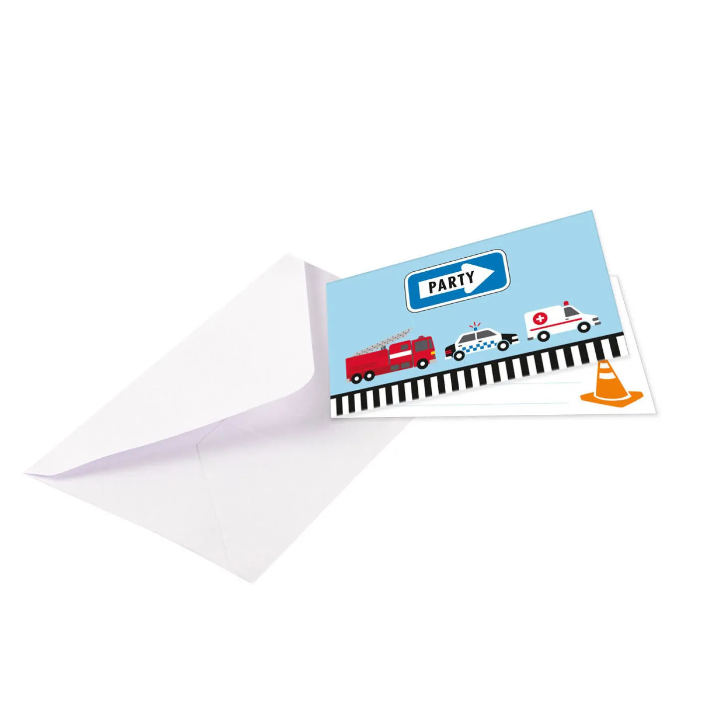 Deze uitnodigingen zijn super leuk voor het verjaardagsfeestje van een kleine autoliefhebber. De kaart is bedrukt met een ambulance, een brandweerwagen en een politiewagen. De set bevat acht uitnodigingen inclusief enveloppen.