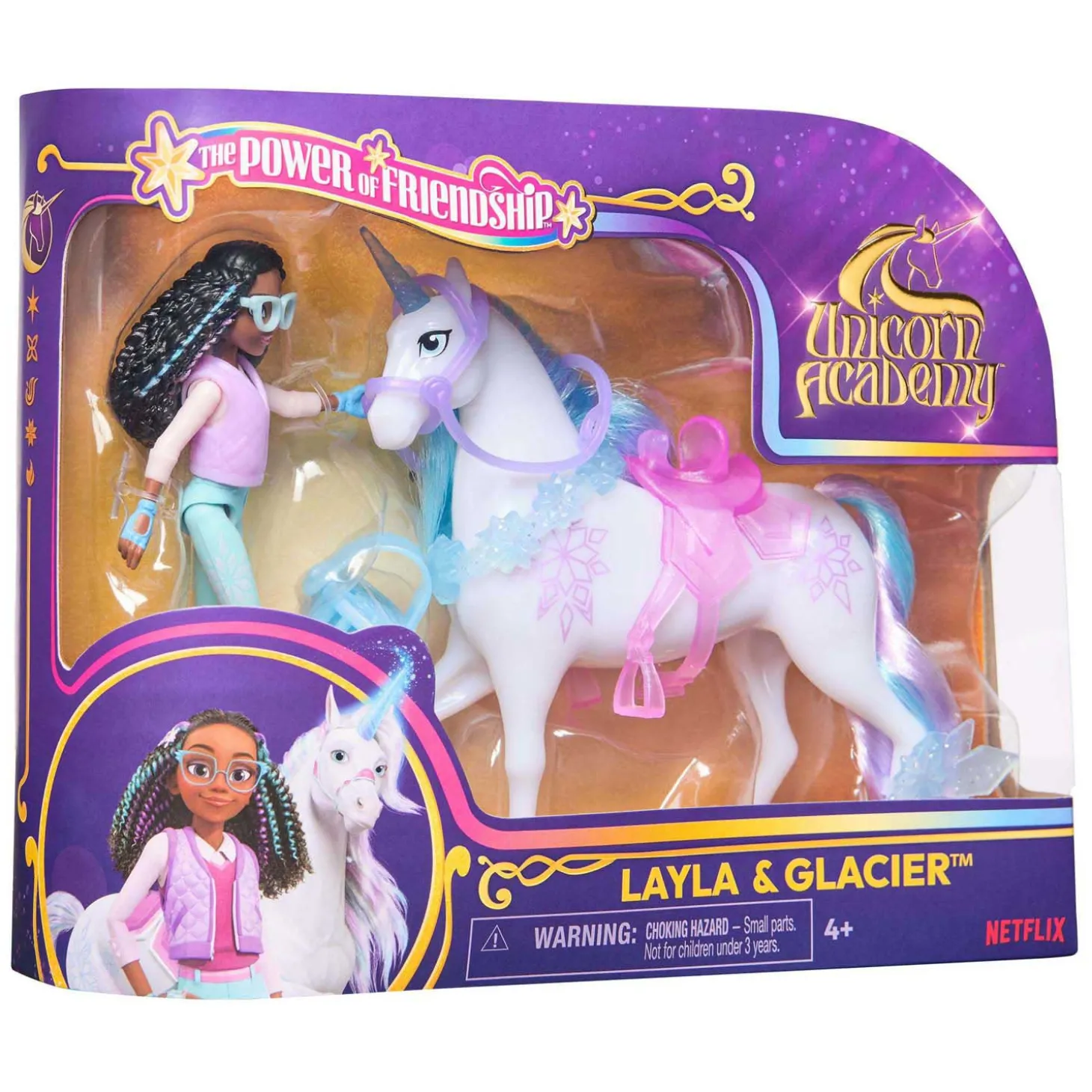 Eenhoorn Glacier, ongeveer 13 cm groot, past perfect bij Layla met prachtige details zoals metallic Ice Magic-markeringen. De set bevat ook twee doorschijnende, afneembare krachtelementen voor om haar nek en been, evenals een borstel om haar manen mooi te houden. Layla kan op Glacier geplaatst worden voor spannende avonturen. Dankzij het transparante, afneembare hoofdstel en zadel blijft ze stevig zitten tijdens het spelen.