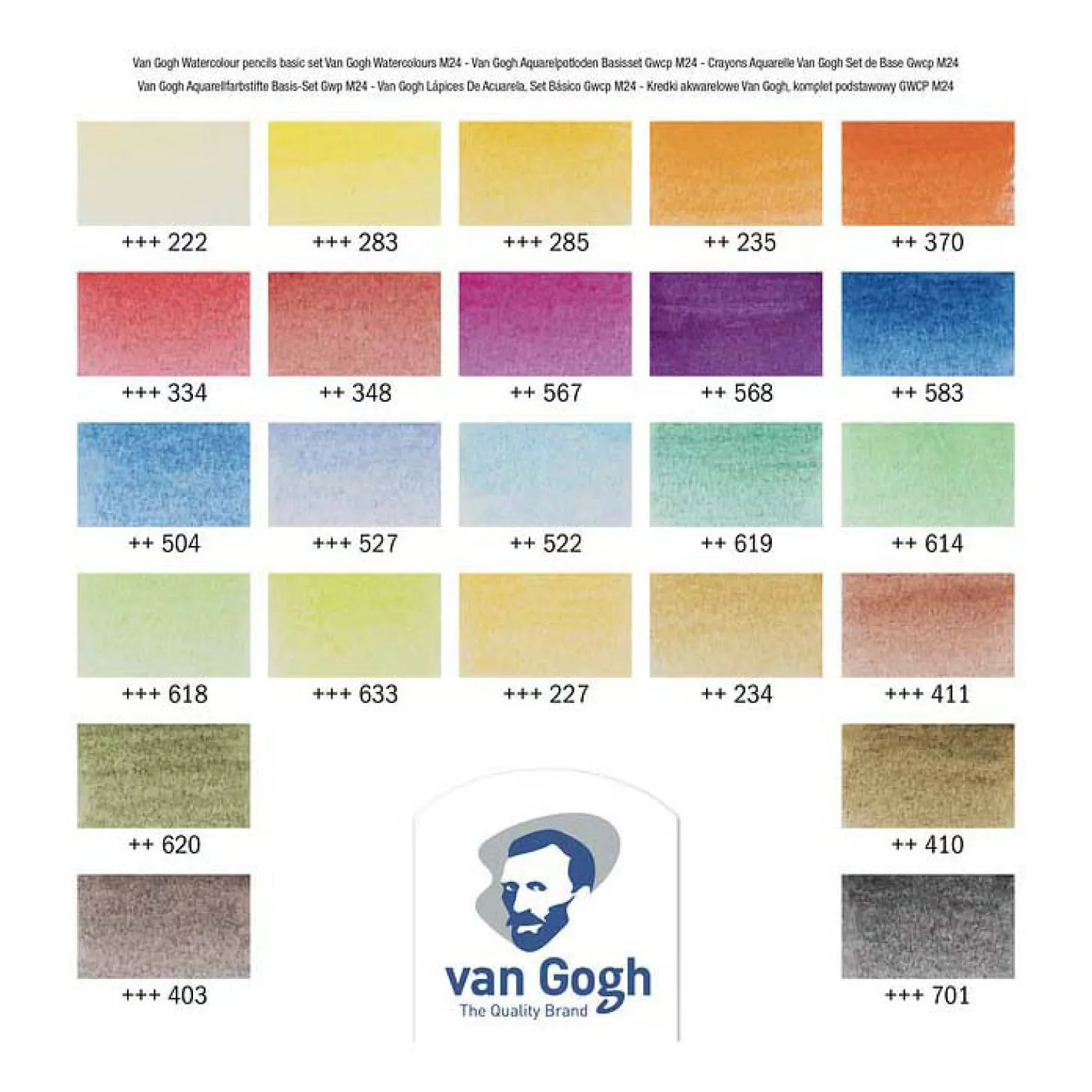 met deze prachtige in water oplosbare kleuren in potloodformaat kun je prachtige aquarellen maken! De unieke kunstenaarspotloden van Van Gogh zijn gemaakt met lichtechte pigmenten. De omhulsels zijn gemaakt van duurzaam gekapt cederhout: zacht hout dat makkelijk te slijpen is. Ervaar deze krachtige kleuren met uitstekende kleurafgifte. Deze 24-delige basisset in blik met aquarelpotloden bevat de volgende kleuren: Napelsgeel licht (222), Permanentgeel licht (283), Permanentgeel donker (285), Oranje (235), Permanentrood licht (370), Scharlaken (334), Permanentrood purper (348), Permanentroodviolet (567), Permanent blauwviolet (568), Phtaloblauw rood (583), Ultramarijn (504), Hemelsblauw (527), Turkooisblauw (522), Permanentgroen donker (619), Permanentgroen middel (614), Permanentgroen licht (618), Permanentgeelgroen (633), Gele oker (227), Sienna naturel (234), Sienna gebrand (411), Olijfgroen (620), Omber groenachtig (410), Van Dijckbruin (403), Ivoorzwart (701).