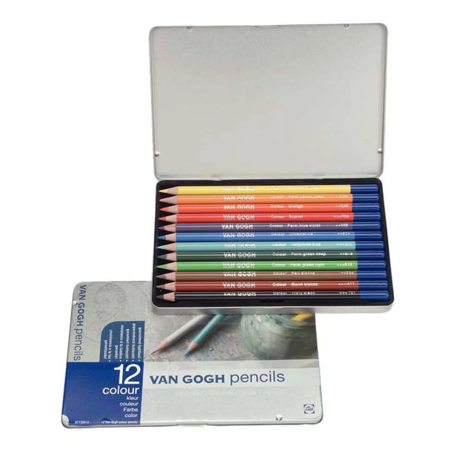 Aanschouw de pracht van fraaie kleuren in potloodvorm! De unieke kunstenaarspotloden van Van Gogh zijn gemaakt met lichtechte pigmenten. De omhulsels zijn gemaakt van duurzaam gekapt cederhout: zacht hout dat makkelijk te slijpen is. Ervaar deze krachtige kleuren met uitstekende kleurafgifte. Deze 12-delige starterset in blik met kleurpotloden bevat de volgende kleuren: Permanentgeel licht (283), Permanentgeel donker (285), Oranje (235), Scharlaken (334), Permanent blauwviolet (568), Ultramarijn (504), Olijfgroen donker (622), Permanentgroen donker (619), Permanentgroen licht (618), Sienna naturel (234), Sienna gebrand (411), Ivoorzwart (701).