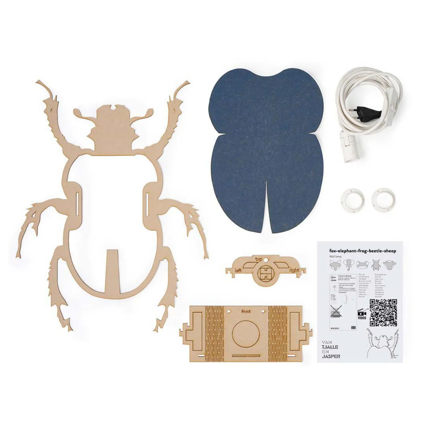 De kever wandlamp wordt geleverd als een handig doe-het-zelf bouwpakket. In de doos vind je alle benodigde onderdelen en een duidelijke handleiding. De montage is eenvoudig en duurt slechts enkele minuten. **Let op: de lichtbron wordt niet meegeleverd.** Wij adviseren een energiezuinige LED-lichtbron.