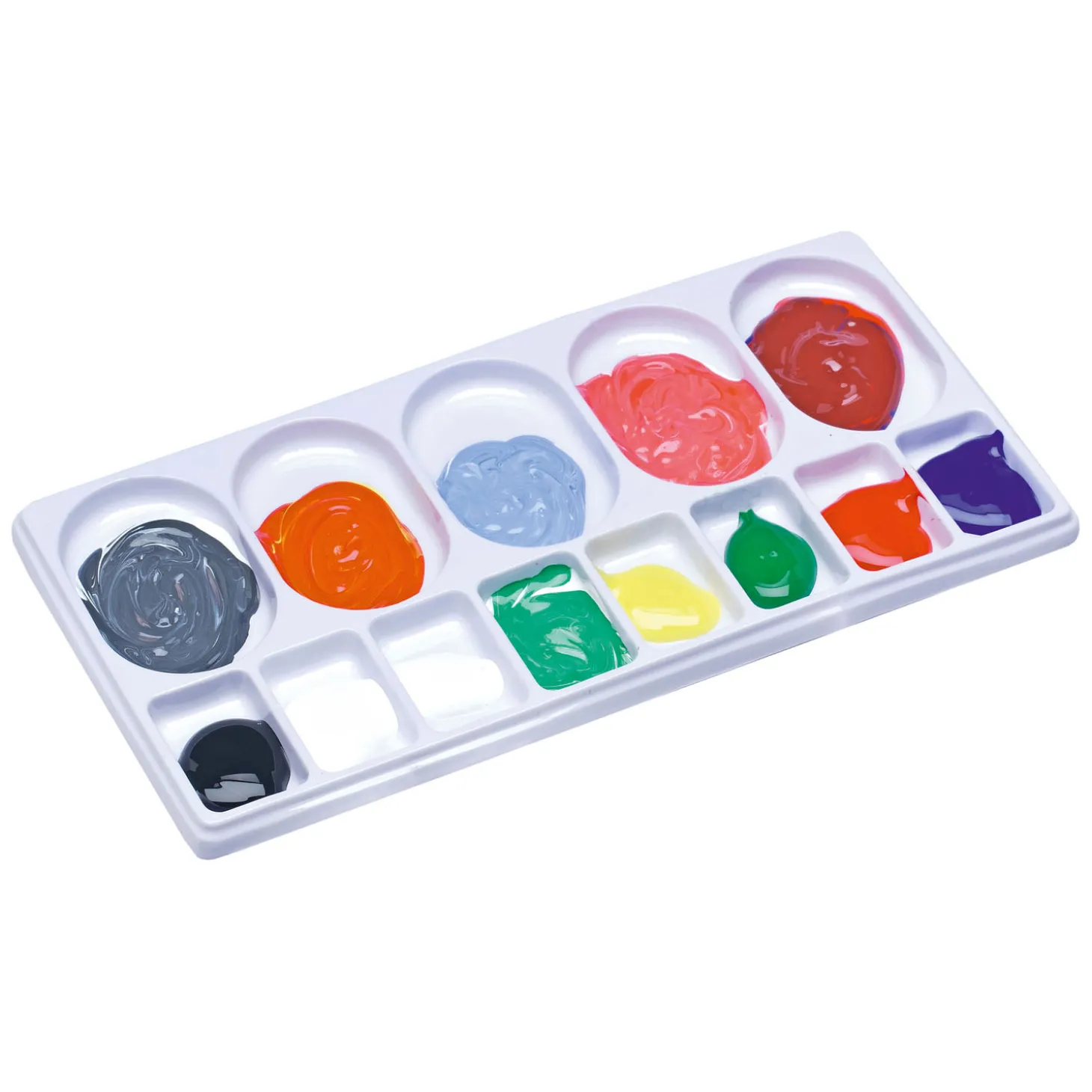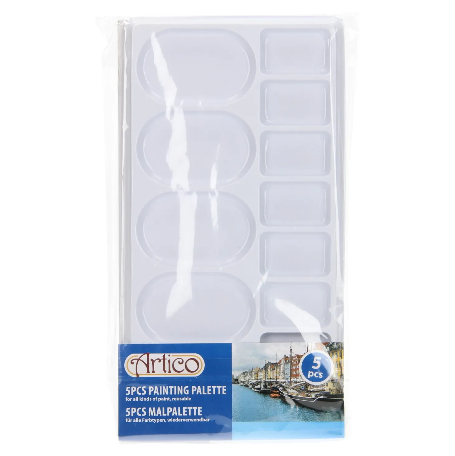 Houd je verf bij de hand tijdens het schilderen met dit handige verfpalet. Vul de vakken met de juiste kleuren, meng ze in de grotere vakken en je kunt aan de slag met schilderen. In de set vind je 5 herbruikbare verfpaletten voor verschillende soorten verf.