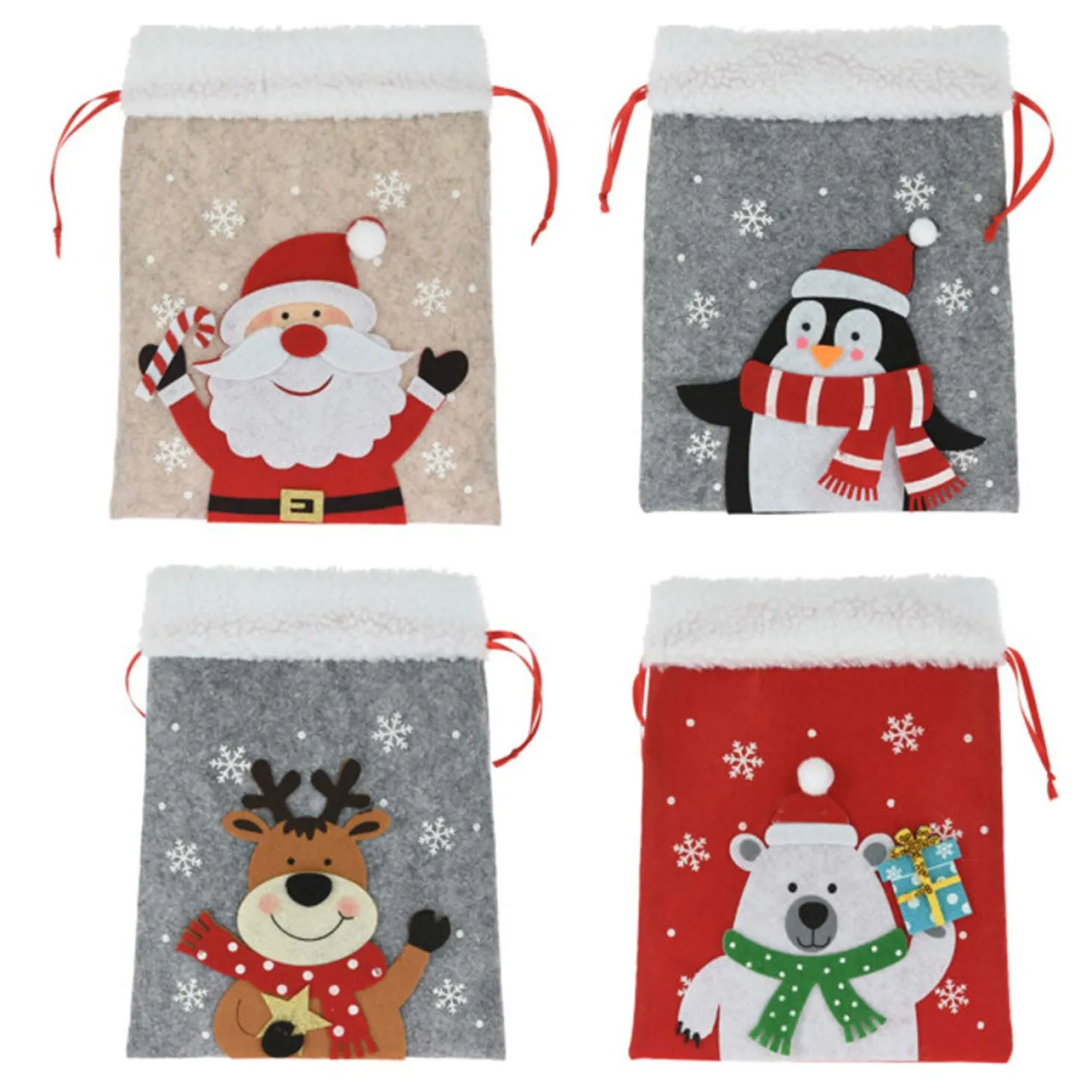 Met de figuren kerstman, ijsbeer, pinguïn en rendier. Gemaakt van vilt en pluche. Afmetingen: 26 x 21 centimeter.Prijs per stuk, verschillende uitvoeringen/kleuren worden door elkaar geleverd.