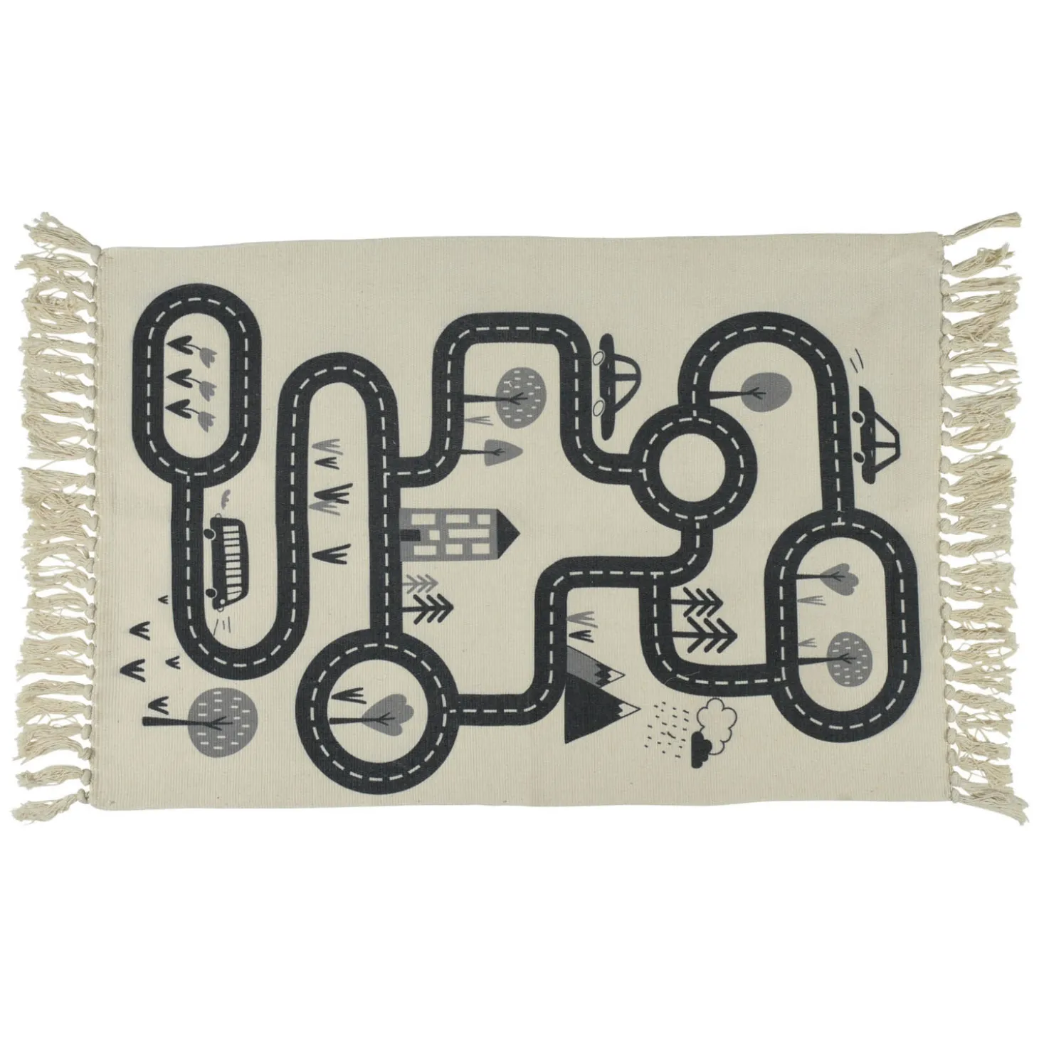 Het tapijt is 80 x 120 centimeter groot en heeft aan de korte zijden vrolijke franjes. Met de hand wassen.