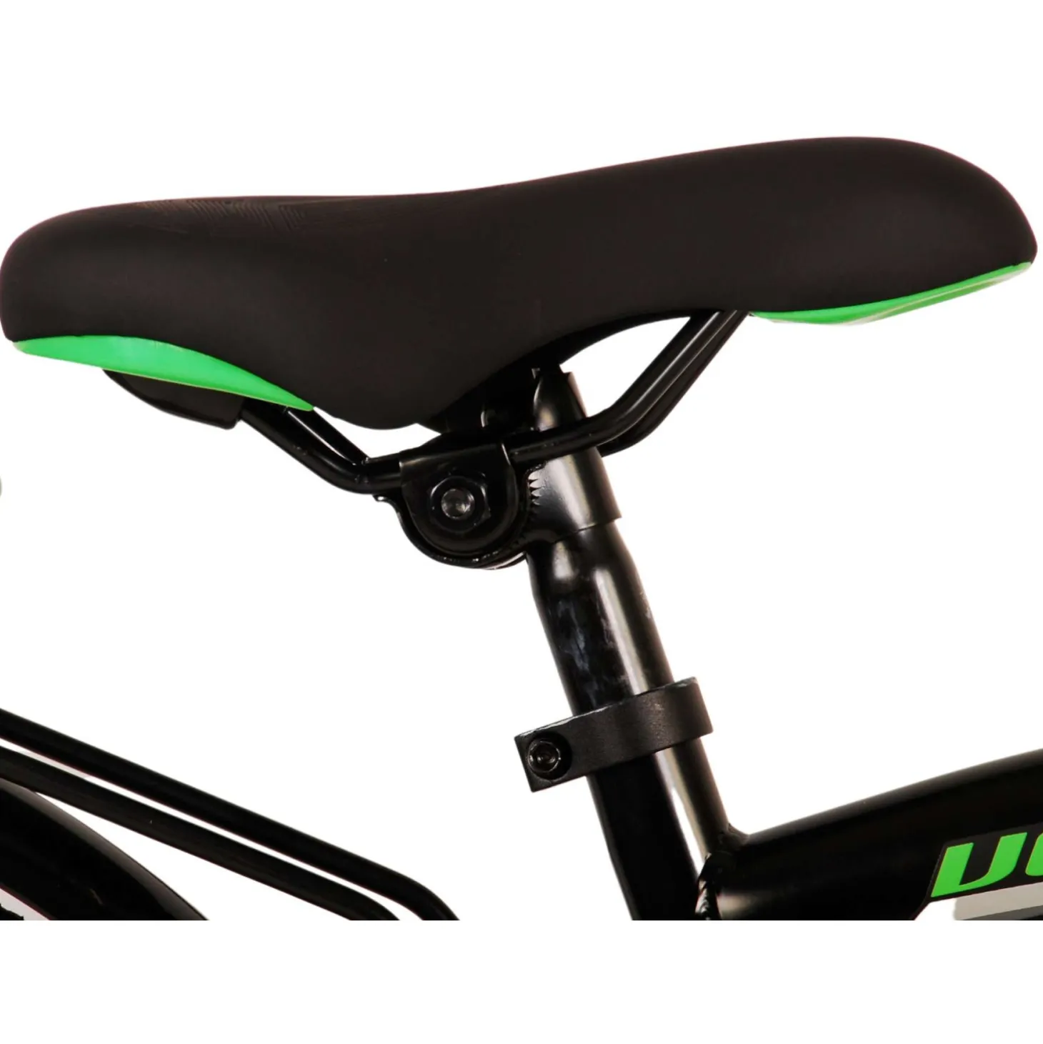 Veiligheid staat voorop! Daarom heeft deze gave fiets een handrem en terugtraprem en verlichting op batterij voor en achter. Daarnaast heeft de fiets een leuke bel en reflectoren in de wielen. Ook aan het comfort is gedacht. De mooie zwarte Volare fiets met groene accenten heeft een luxe zacht zadel en extra zachte handvaten, een handige achterdrager, en een stevig frame dat wel tegen een stootje kan. Verder heeft de fiets een standaard zodat hij netjes blijft staan en een sterk slot. Om zo lang mogelijk van de fiets te kunnen genieten heeft deze een extra lange zadelpen waardoor de fiets nóg langer met het kind meegroeit en ook het stuur is in hoogte verstelbaar.