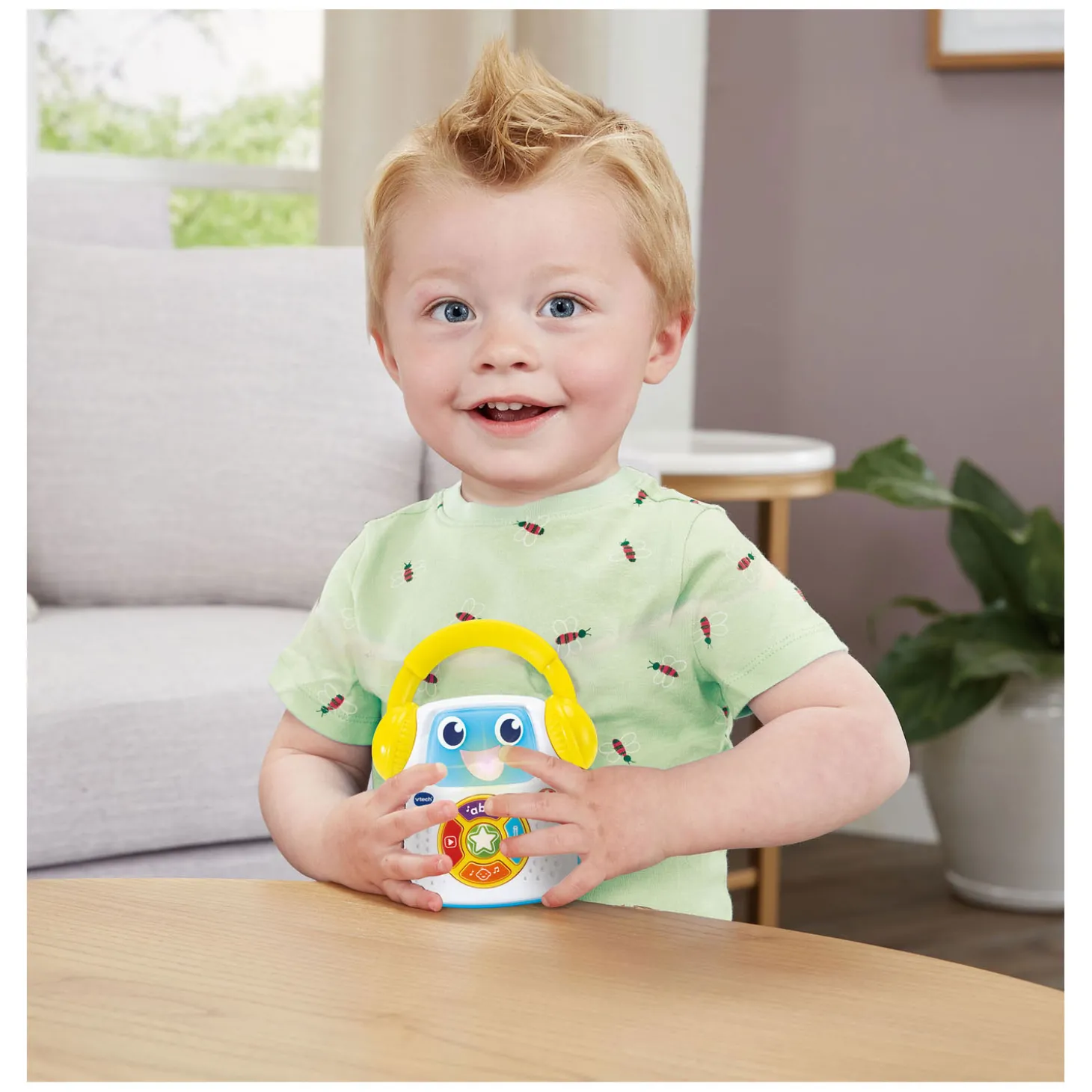 Tijd voor een dansfeestje met deze vrolijke muziekspeler! Inclusief 23 melodietjes en 9 gezongen liedjes. Neem je eigen stem op en luister deze terug met grappige vervormingseffecten. De lichtjes in de geanimeerde mond zorgen voor een grappig effect. Druk op de andere toetsen om naar vrolijke zinnetjes, melodietjes en gezongen liedjes te luisteren én spelenderwijs kennis te maken met letters en cijfers!